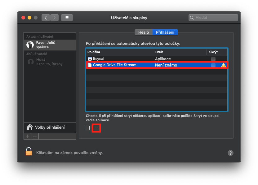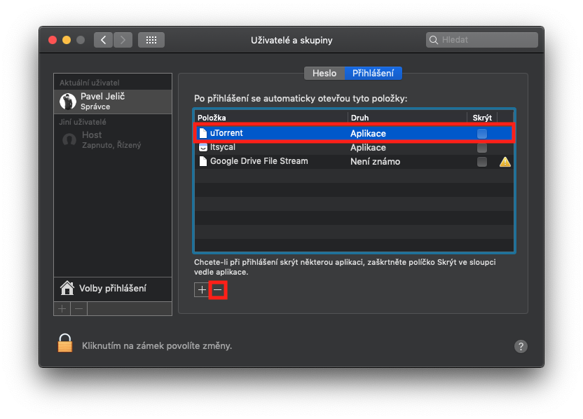Pro zobrazení aplikací, které se automaticky spouštějí po startu zařízení, se musíte přesunout do Předvoleb systému. Proto klikněte v levém horním rohu na ikonu Apple loga a za rozevíracího menu, které se zobrazí, vyberte možnost Předvolby systému… Nyní se zobrazí nové okno, ve kterém klikneme na sekci Uživatelé a skupiny, která se nachází na první pozici ve čtvrtém řádku. Poté si v levém menu zvolte uživatelský účet, pro který chcete aplikace zobrazit. Po rozkliknutí účtu už jen stačí v horním menu zvolit možnost Přihlášení. Zde už se nachází seznam všech aplikací, které se spouští po startu systému. U každé aplikace si můžete zaškrtnout možnost Skryto, což znamená, že se aplikace po startu spustí, avšak nezobrazí se – spustí se skrytě.