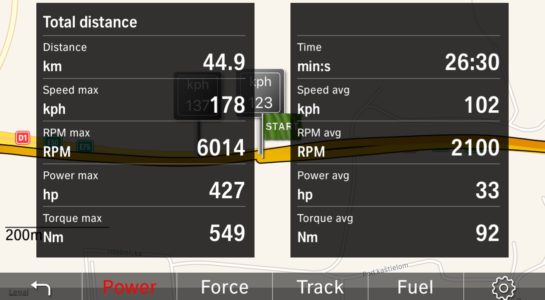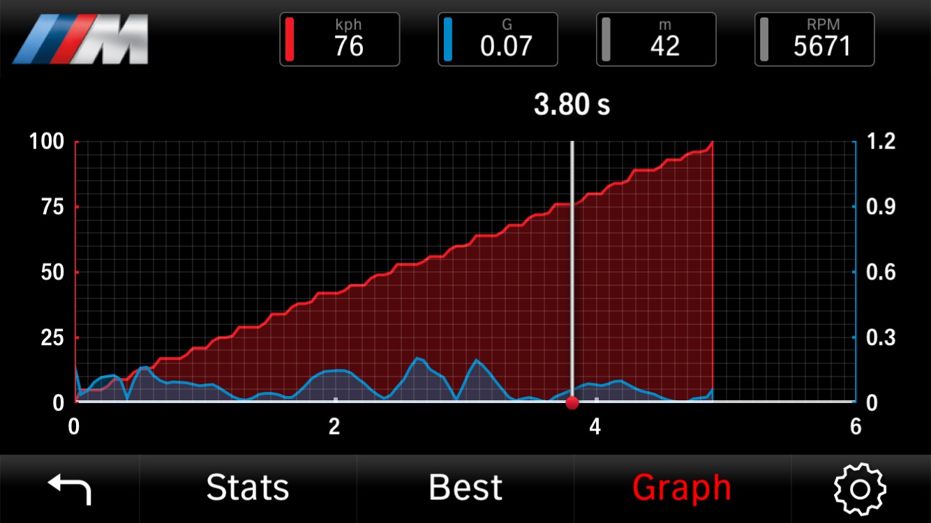 Jedna z nejzajímavějších položek v celé aplikaci vám umožní snadno změřit zrychlení z 0-100 km/h včetně grafu s nárůstem výkonu. Změřit můžete také zrychlení z 80 km/h na 120 km/h, čas na čtvrt míle, uspořádat soutěž s kamarádem a také změřit délku brzdné dráhy. To vše jsou věci, které nedokážete změřit přesně jen pomocí stopek nebo v případě brzdné dráhy metru. Díky aplikaci lze vše změřit na setiny vteřiny, respektive centimetry přesně.