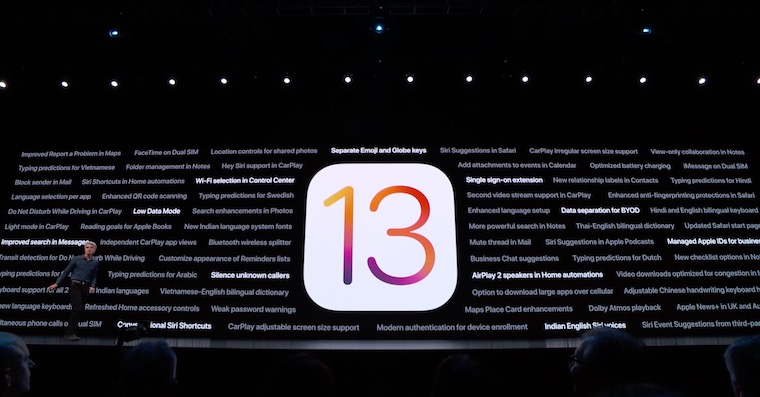 Hned na úvod části věnované iOS 13 se Tim Cook pochlubil tím, že se stávajícím iOS 12 je spokojeno na 97 % lidí a je že je nainstalováno na 85 % zařízení, což je v porovnání s předešlým iOS 11, který obsahoval celou řadu chyb, takřka neuvěřitelné. Konkurenční Android 9 je pak nainstalován dokonce jen na 10 % zařízení. Poté už přišla řada na Craiga Federighigo, který iOS představoval i v loňských letech.