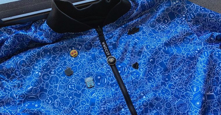 V předešlých letech Apple vsázel na džínovou bundu Levi’s a pár připínacích odznáčků. Letos vývojáře bundou potěšil také, avšak již se nejedná o riflovinu, ale zřejmě o softshell či podobný materiál. Díky tomu může být bunda pro letošní ročník WWDC oboustraná, kdy jedna strana je černá a zdobená logy Applu jen střídmě a druhá naopak barevná, přičemž odstínů je celá řada, a plná grafik, které Apple použil na pozvánkách. Co se pak týče odznáčků nebo chcete-li placek, i ty se dočkaly drobného upgradu. Nejsou totiž již připínací na špendlík, ale magnetické. Díky tomu tak vývojářům nevznikají v bundách malé dírky, což je rozhodně příjemný bonus. Složení odznáčků je pak víceméně stejné jako každý rok – tedy vlajka země, ze které vývojář pochází, logo Applu, několik odznáčků s motivy WWDC a držitelé studentských stipendií pak mají navíc i speciální “stipendijní” odznáček. Studenti, kteří se na WWDC dostanou díky stipendiu, pak mají oproti vývojářům ještě jeden bonusový dárek – tričko. To je zpracováno v designu pozvánky na vývojářskou konferenci a je tedy tmavě modré se spoustou různorodých motivů.