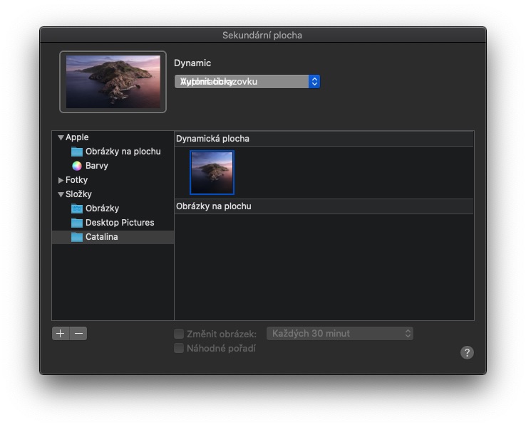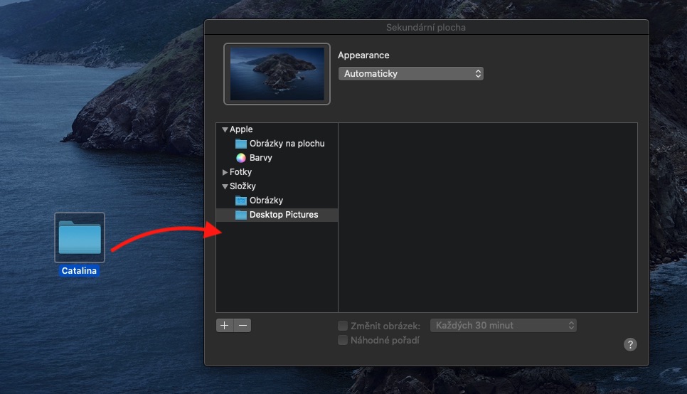 Nejprve je samozřejmě důležité, abyste si dynamickou tapetu někde stáhli. Internet je plný tapet z macOS 10.15 Catalina, avšak většina z nich jsou klasické statické tapety, které se nebudou postupem času měnit. Naštěstí však pro vás se mi podařilo „ukořistit“ správnou verzi tapety, která je doopravdy dynamická a bude se měnit. Tapetu si stáhněte pomocí tohoto odkazu a soubor uložte například na plochu. Po stažení na ploše vytvořte složku s libovolným názvem, například „Catalina„, a stažený soubor do ní vložte. Nyní klikněte v levém horním rohu obrazovky na ikonu Apple loga a z rozevíracího menu, které se zobrazí, klikněte na možnost Předvolby systému. Zde poté rozklikněte sekci Plocha a spořič, která se nachází v prvním řádku na druhé pozici. Zobrazí se okno, do jehož levého menu musíte složku se staženou tapetou přesunout. Po přesunutí už jen stačí tapetu nastavit na všech vašich displejích.