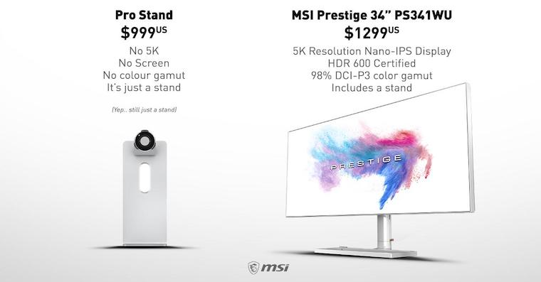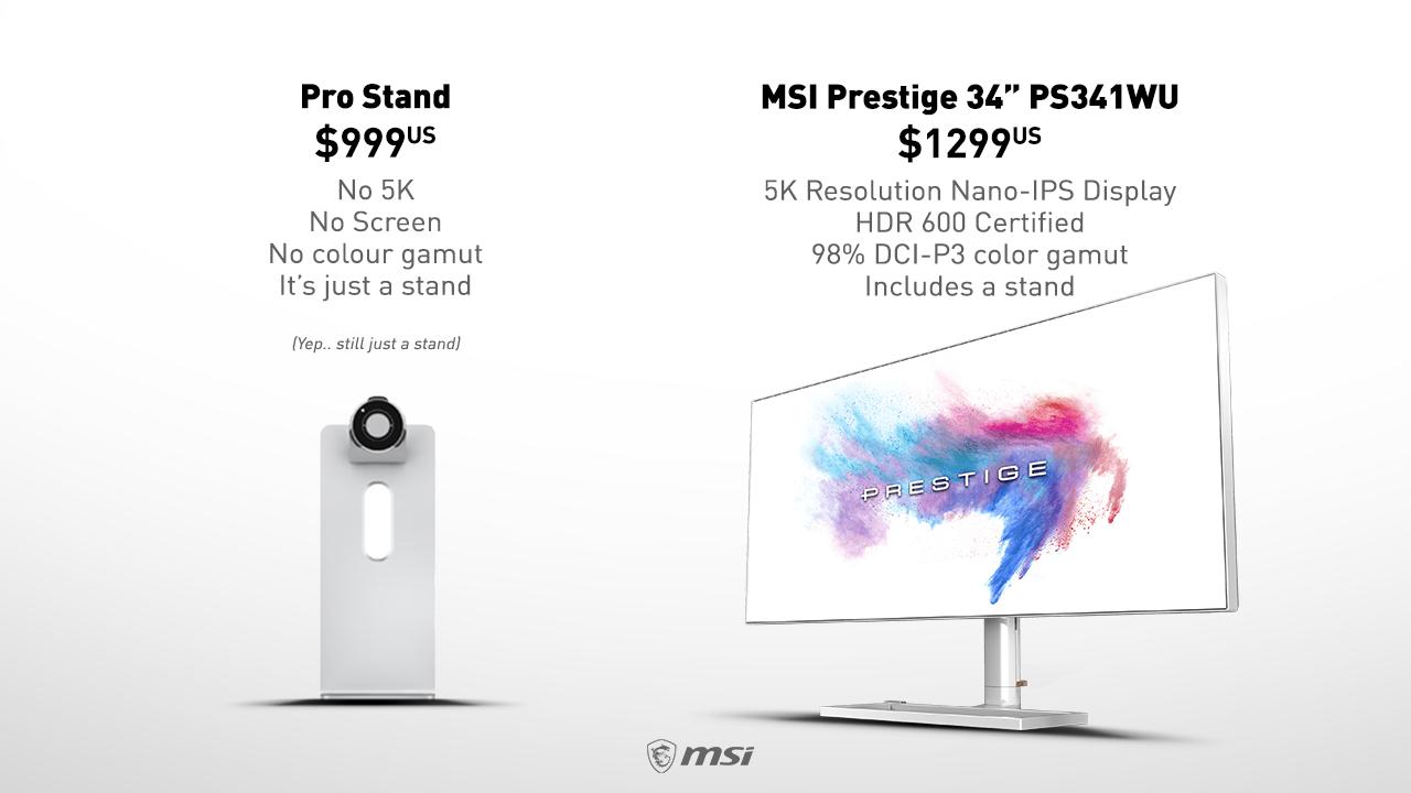 Se zřejmě nejvýraznějším vtípkem přispěchala tchajwanská společnost MSI, která vyrábí výpočetní techniku. Ta na svém Twitteru sdílela vcelku úsměvné porovnání, ve kterém proti sobě postavila stojan Applu se svým chystaným monitorem, který má cílit na náročné uživatele. Zatímco za stojan zaplatíte Applu 999 dolarů, MSI si svůj monitor, který má dorazit na pulty obchodů příští rok, bude účtovat “jen” 1299 dolarů. Za tuto cenu dostanete 34” displej s rozlišením 5120 x 2160, USB-C porty, relativně úzkými rámečky a plastovým tělem. Řešení od MSI chybí samozřejmě celá řada dalších vychytávek, kterými se může profesionální displej od Applu chlubit a které právě jeho cenu šponují vzhůru. V porovnání s “obyčejným” stojanem je však displej vlastnostmi i celou jasný vítěz.