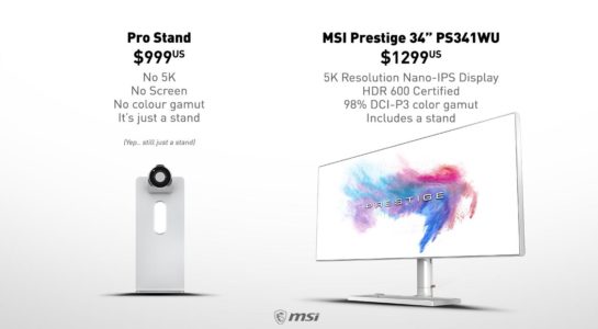 Se zřejmě nejvýraznějším vtípkem přispěchala tchajwanská společnost MSI, která vyrábí výpočetní techniku. Ta na svém Twitteru sdílela vcelku úsměvné porovnání, ve kterém proti sobě postavila stojan Applu se svým chystaným monitorem, který má cílit na náročné uživatele. Zatímco za stojan zaplatíte Applu 999 dolarů, MSI si svůj monitor, který má dorazit na pulty obchodů příští rok, bude účtovat “jen” 1299 dolarů. Za tuto cenu dostanete 34” displej s rozlišením 5120 x 2160, USB-C porty, relativně úzkými rámečky a plastovým tělem. Řešení od MSI chybí samozřejmě celá řada dalších vychytávek, kterými se může profesionální displej od Applu chlubit a které právě jeho cenu šponují vzhůru. V porovnání s “obyčejným” stojanem je však displej vlastnostmi i celou jasný vítěz.