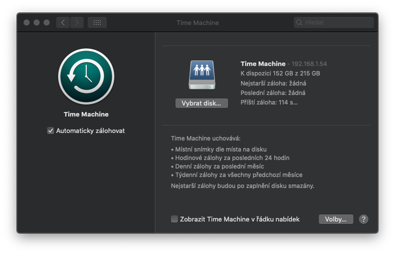 Na vašem macOS zařízení otevřete aplikaci Time Machine – v levém horním rohu obrazovky klikněte na ikonu Apple loga a zvolte možnost Předvolby systému… V novém okně, které se zobrazí, rozklikněte sekci Time Machine. Poté klikněte na tlačítko Vybrat zálohovací disk… a z menu, které se zobrazí, vyberte sdílenou složku Time Machine a klikněte na Použít disk. Poté se opět přihlaste stejně jako v minulém kroku pomocí speciálního uživatele. To je celý postup, nyní už jen stačí vyčkat na spuštění prvotního zálohování.