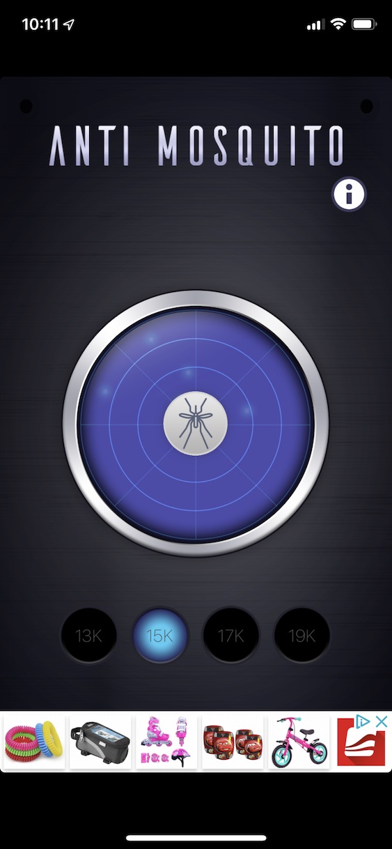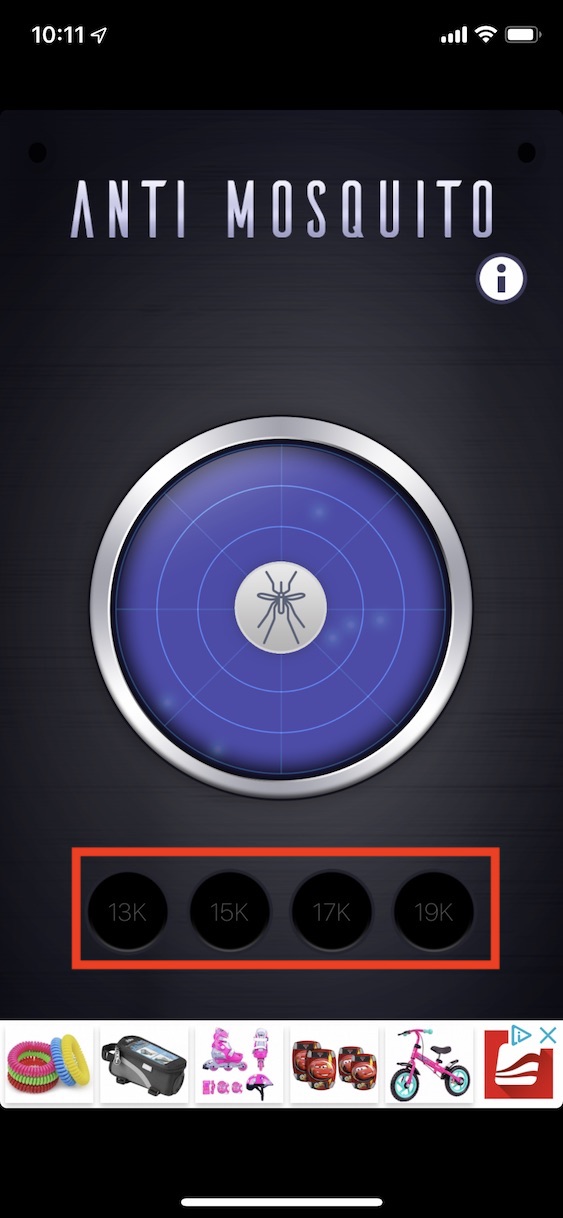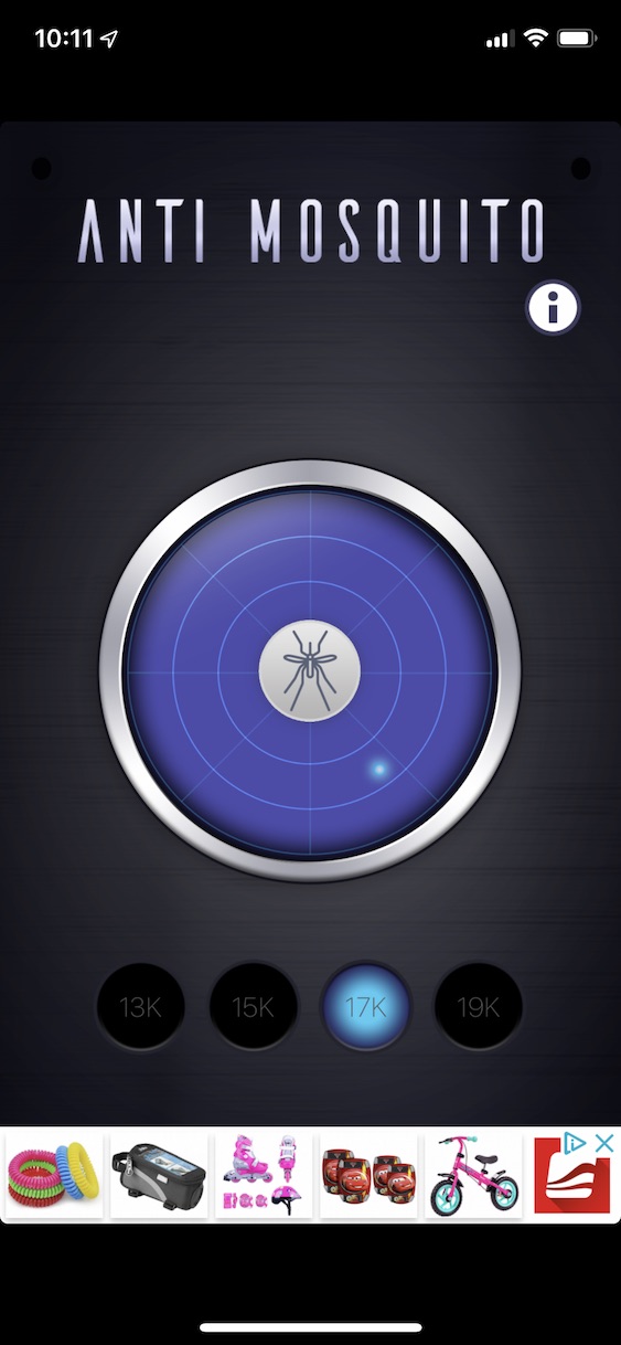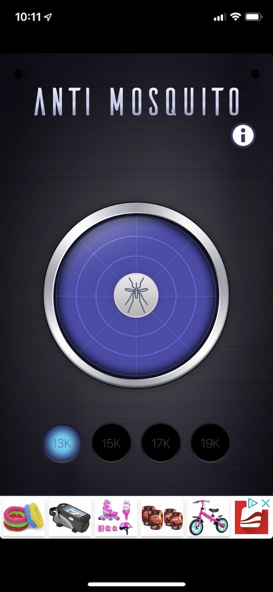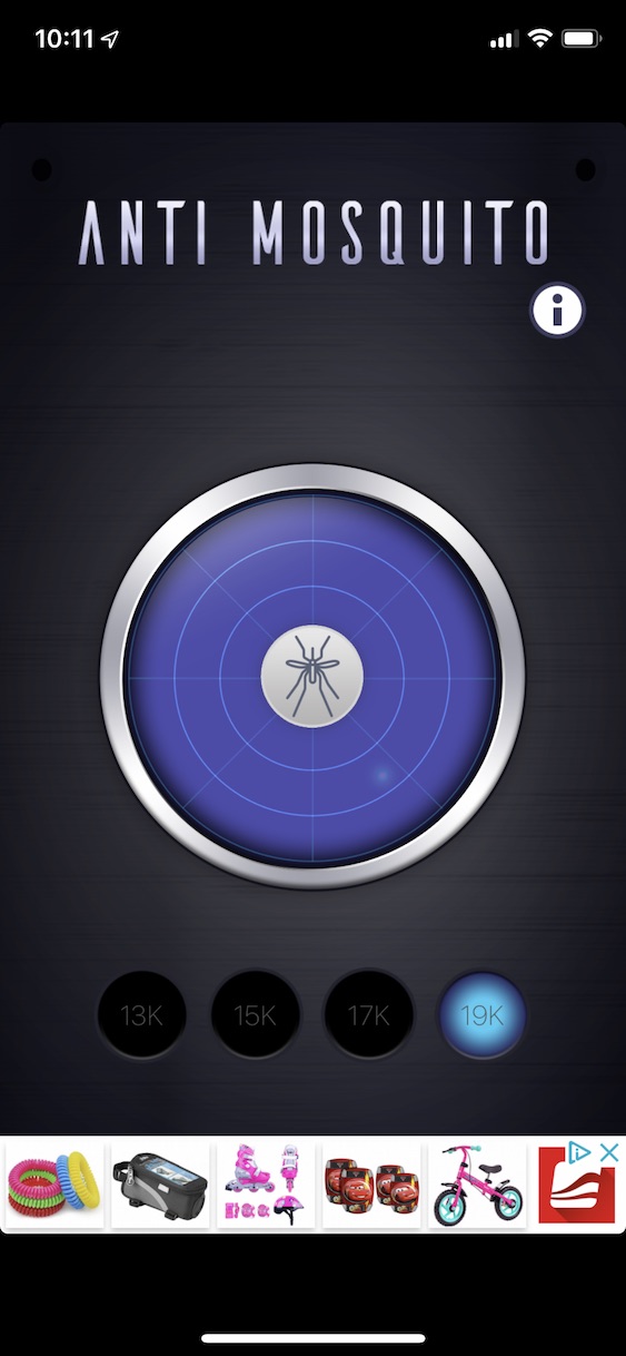 App Store je plný aplikací, které mají sloužit pro odpuzení komárů. Osobně jsem jich vyzkoušel více, avšak jedna z nich je mi nejsympatičtější. Jedná se o aplikaci Anti Mosquito Repeller Sonic, která má velice jednoduché ovládání a zvládne to, co potřebujete. Aplikace je zdarma, občas se v ní nachází reklamy, které však nejsou nikterak otravné a můžete je kliknutím zavřít. Ovládání aplikace je velice jednoduché. Po spuštění si můžete ve spodní části obrazovky všimnout čtyř tlačítek – 13K, 15K, 17K a 19K. Tyto tlačítka reprezentují zvuk v kHz, a po stisknutí každého z nich začne vaše zařízení vydávat zvuk, který odpovídá vaší volbě. Osobně se mi nejvíce osvědčil zvuk o 19 kHz, kdy jej stačilo mít aktivní doopravdy jen pár vteřin a většina komárů se ihned vzdálila pryč. Obecně platí, že čím vyšší je frekvence zvuku, tak tím více jej komáři nesnáší a budou se od něho vzdalovat.