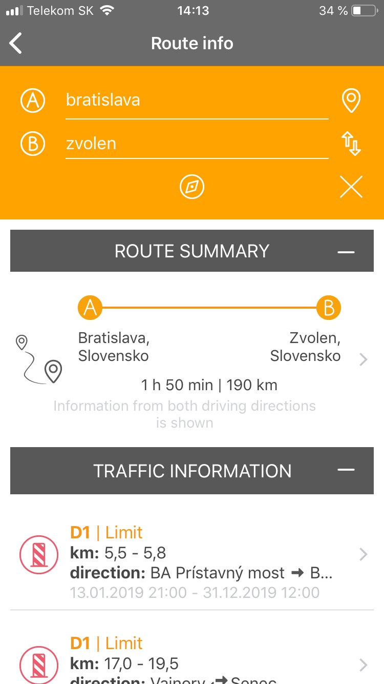 Základní funkcí aplikace je poskytování dopravních informací, ovšem díky tomu, že se jedná o oficiální aplikaci NDSAS, máte jistotu, že jsou veškeré informace nejčerstvější, jak jen mohou být. Přehled navíc zahrnuje také chystané uzavírky nebo omezení a vy okamžitě vidíte, co vás na vaší trase čeká a zda není lepší některé místo vynechat. Informace jsou zaručené, aktuální a máte je takříkajíc z první ruky. Máte také možnost zvolit si, odkud kam pojedete a aplikace vám automaticky vypíše veškeré dopravní omezení, kamery, odpočívadla a turistické zajímavosti, které jsou na vámi zvolené trase.