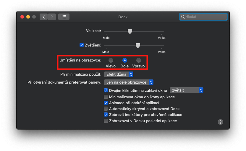 Přesunutí Docku je v macOS velice jednoduché. Stačí v levém horním rohu, v prostředí horní lišty, kliknout na ikonu Apple loga. Poté se zobrazí rozbalovací menu, ve kterém klikněte na možnost Předvolby systému… Zde poté rozklikněte sekci Dock, která se nachází v prvním řádku na třetí pozici. Po rozkliknutí se zobrazí veškeré možnosti, které můžete v rámci Docku změnit. Nás v tomto případě ale zajímá možnost Umístění na obrazovce, kde si pomocí políčka můžete zvolit, zdali chcete Dock umístit na levou či pravou stranu obrazovky, anebo samozřejmě dolů.