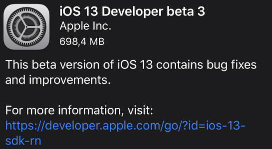 Screenshot aktualizace iOS 13 Beta 3