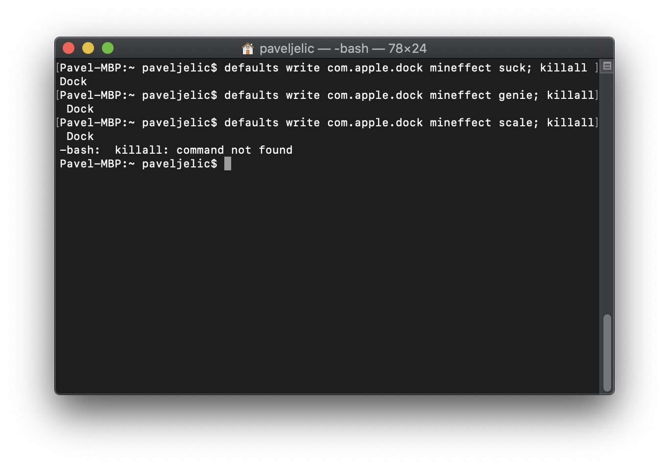 defaults write com.apple.dock mineffect suck; killall Dock