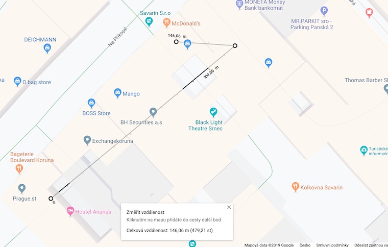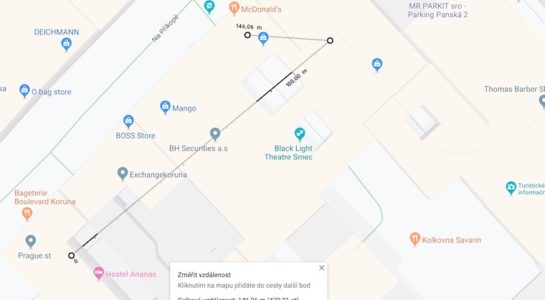 V Google Maps v prostředí webového prohlížeče můžete také snadno měřit vzdálenost mezi dvěma body. Stačí pravým tlačítkem myši kliknout kamkoliv na mapu a zvolit možnost měření vzdálenosti. Pak už jen zvolíte druhý bod a můžete měřit.