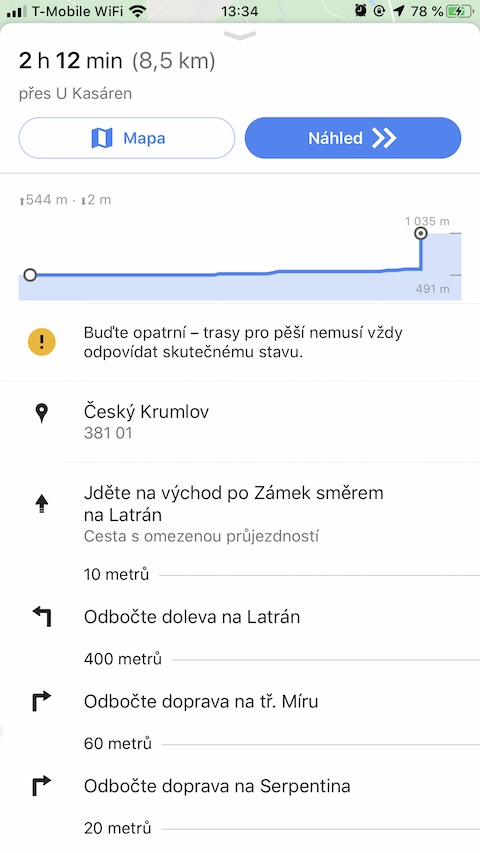 Chystáte se na cyklovýlet a chcete vědět, kolik práce budete mít se stoupáním do kopce? Ještě než vyrazíte, otevřete Google Maps, zadejte do nich trasu a zvolte jízdu na kole. V popisu trasy se pak zobrazí graf s údaji o strmosti jednotlivých úseků vašeho výletu.