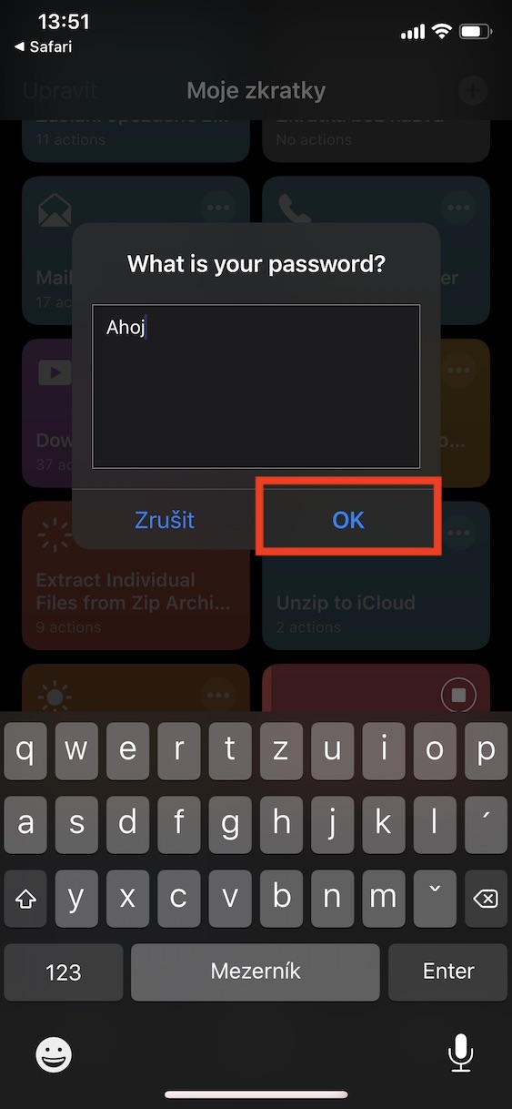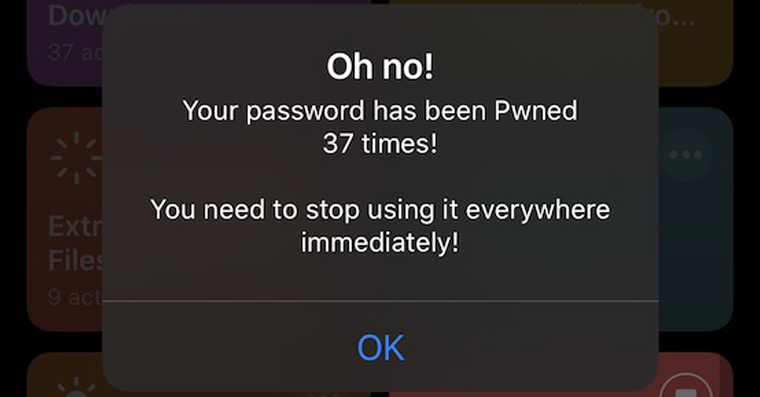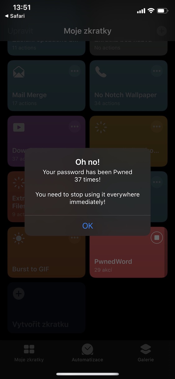 Zkratku, o které jsem mluvil v úvodu, můžete stáhnout pomocí tohoto odkazu. Pokud instalujete zkratku z iOS 13, tak je nutné, abyste si v Nastavení -> Zkratky aktivovali možnost Povolit nedůvěryhodné zkratky – v opačném případě zkratku nebudete schopni přidat, jelikož se nenachází v oficiální galerii zkratek. Po přidání zkratky už vám nezbývá nic jiného, než ji spustit. Průběh zjišťování je velice jednoduchý. Zadáte (vaše) heslo, u kterého chcete zjistit, zdali nedošlo k úniku. Poté klikněte na OK a vyčkáte, dokud se celá zkratka neprovede. V závěru budete informováni o tom, zdali došlo k úniku vašeho hesla, či nikoliv. Ke zjištění je nutné, abyste byli připojeni k internetu.