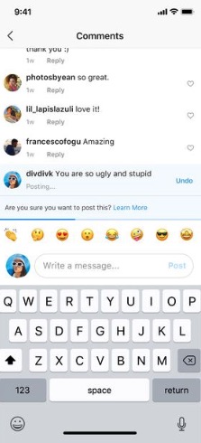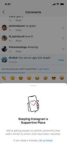První funkce slouží k tomu, aby upozornila uživatele, který přidal potencionálně ofenzivní komentář. Pokud umělá inteligence zjistí, že se může v komentáři objevovat forma šikany, tak se ještě před samotným odesláním komentáře zobrazí oznámení. V tomto oznámení se Instagram dotyčného ptá, zdali si je doopravdy jistý, že chce tento komentář přidat. Tímto se nad sebou může uživatel zamyslet a svůj komentář stáhnout. Podle Mosseriho tato funkce doopravdy funguje a v mnohých případech se lidé uvědomí a buď komentář úplně smažou, anebo jej přepíšou do neurážlivé formy.