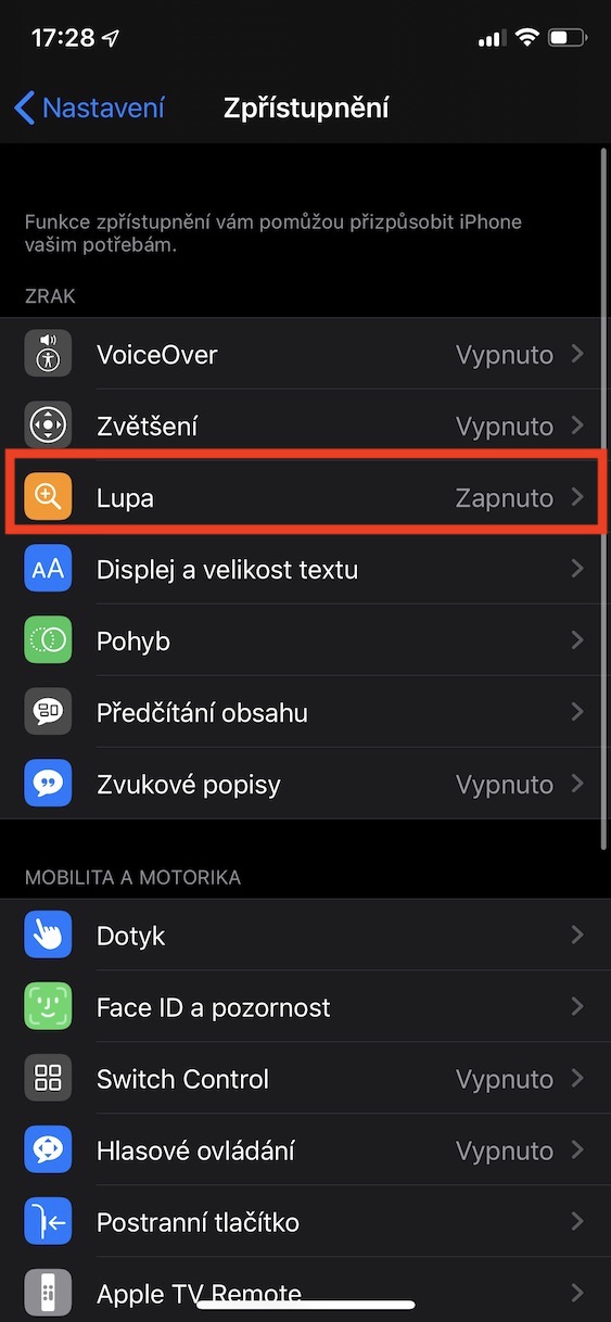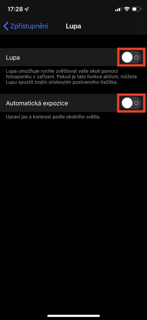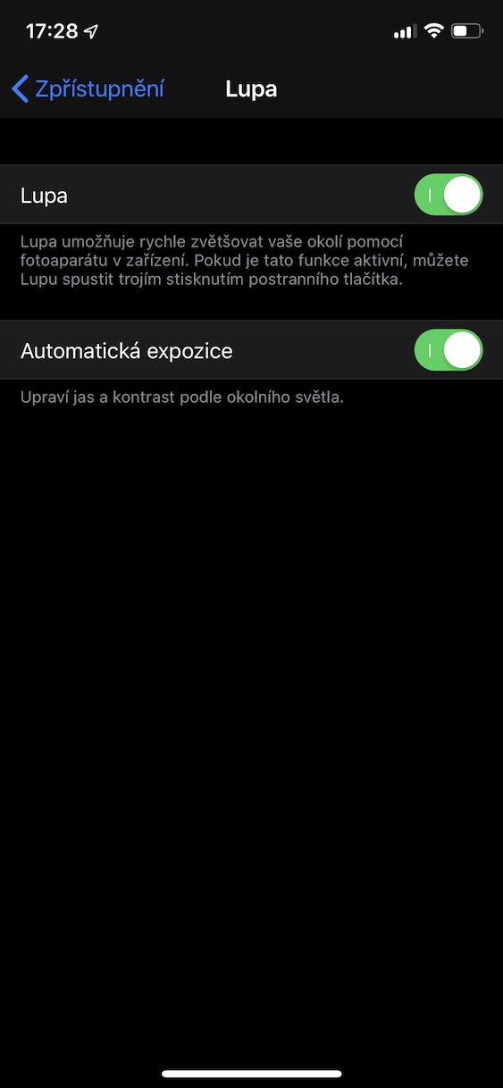 Pokud si chcete na vašem iOS zařízení aktivovat lupu, tak přejděte do nativní aplikace Nastavení. Zde poté sjeďte níže a rozklikněte možnost Obecné. Poté se přesuňte do sekce Zpřístupnění. Tady už jen stačí najít kolonku s názvem Lupa, otevřít ji, a stejnojmennou funkci pomocí přepínače aktivovat. Zároveň vám doporučuji, abyste si aktivovali také funkci s názvem Automatická expozice, aby si lupa sama upravovala kontrast pomocí okolního světla – obraz tak bude zřetelnější.