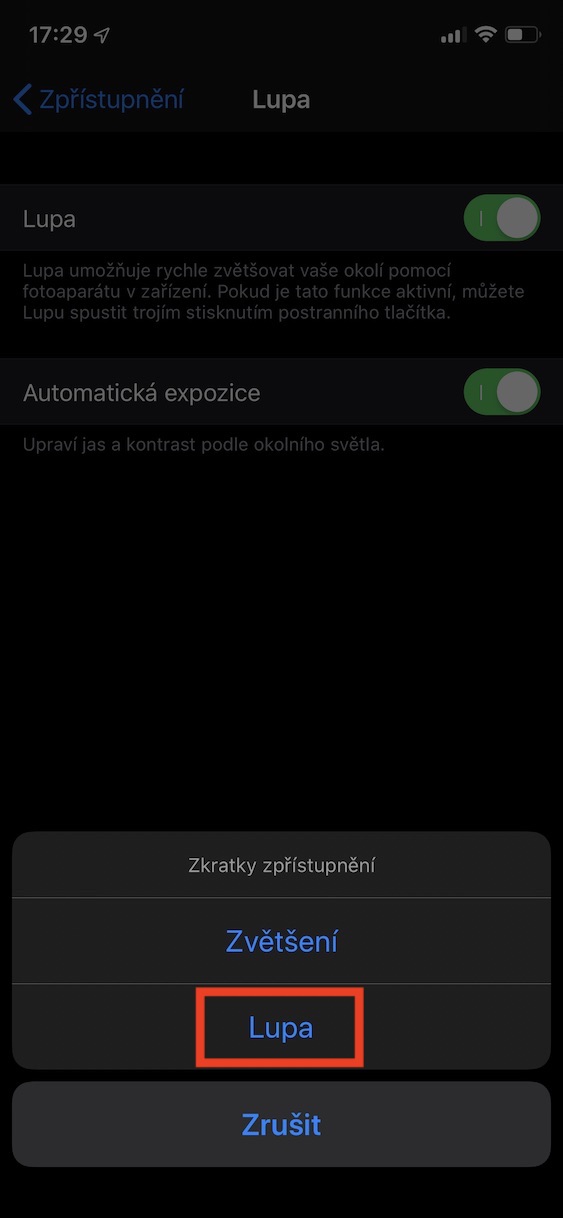 Po aktivaci funkce lupa stačí třikrát po sobě stisknout tlačítko, kterým aktivujete zpřístupnění. Pokud máte iPhone disponující Touch ID, tak je tímto tlačítkem domovské tlačítko. V případě, že váš iPhone disponuje Face ID, tak je tímto tlačítkem boční tlačítko. Pokud už máte nějakou zkratku zpřístupnění nastavenou, tak se po aktivaci zobrazí ve spodní části obrazovky menu, kde musíte zvolit možnost Lupa.