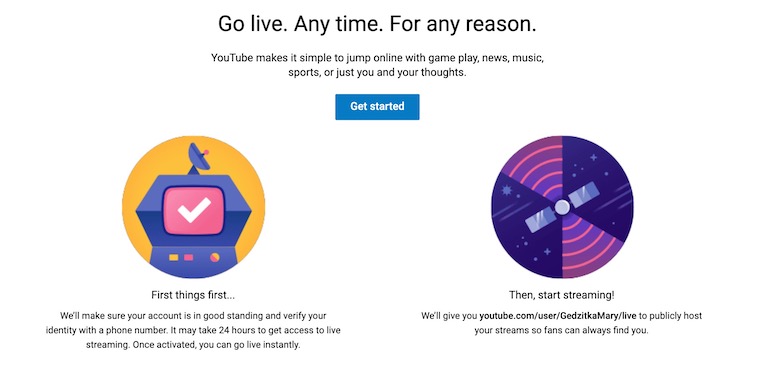 Na svém počítači spusťte web YouTube. Klikněte na tlačítko pro nahrání videa v pravém horním rohu displeje. Zvolte možnost „Go Live“. Pokud streamujete poprvé, klikněte na „Get Started“ a počkejte, až YouTube ověří, zda váš kanál splňuje podmínky pro živé streamování. Poté už se můžete pustit do vysílání.