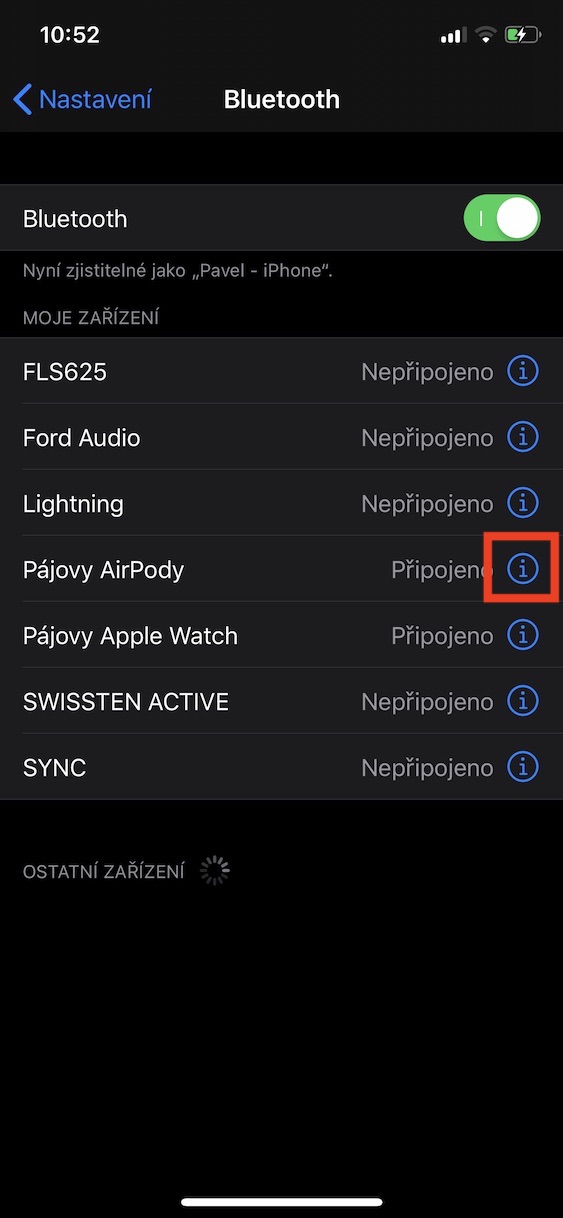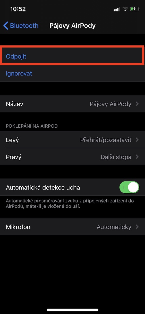 Někdy se stane, že se jen „zblázní“ připojení AirPodů, tzn. Bluetooth. Pokud se tedy trápíte se špatnou kvalitou zvuku, tak zkuste AirPody jednoduše odpojit a znovu připojit. Jedná se sice o klasickou radu, kterou vám řekne každý IT technik. V mnohých případech však ale tato možnost „restartování“ vyřeší mnoho problémů. Pro odpojení sluchátek přejděte do Nastavení, kde rozklikněte Bluetooth. Poté klikněte na ikonku informací u vašich AirPodů a zvolte možnost Odpojit.