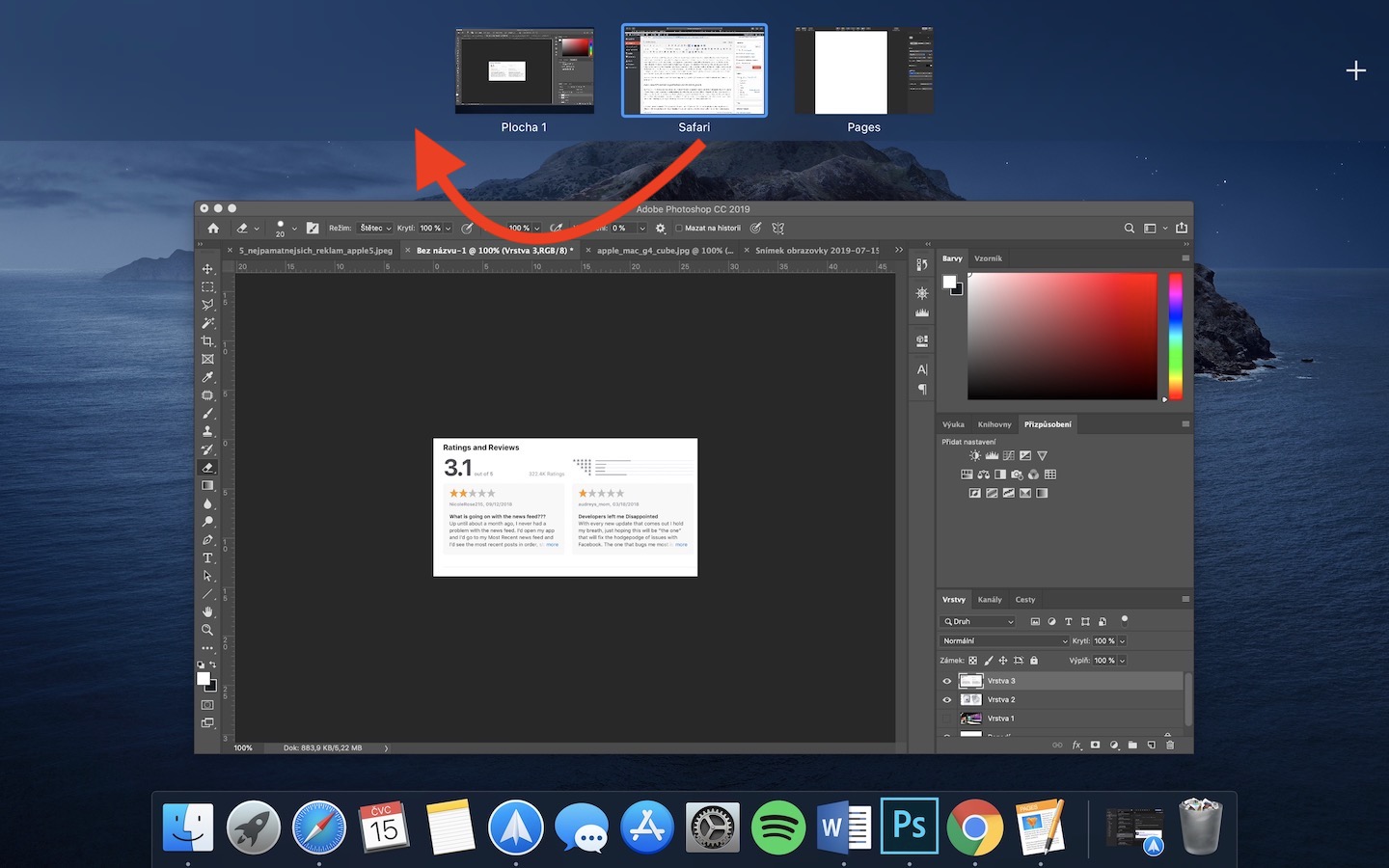 Nejdříve je nutné, abyste se na Macu dostali do prostředí Mission Control. To můžete učinit buď stisknutím klávesy F3, anebo přejetím třemi prsty na trackpadu zdola nahoru. Jakmile se budete nacházet v Mission Control, tak věnujte pozornost horní části obrazovky, kde se nachází názvy otevřených ploch či aplikací. Pokud chcete tyto plochy seřadit, tak stačí, abyste je pomocí kurzoru chytnuli a přesunuli tam, kde to vyžadujete. Pořadí oken se určuje zleva doprava. Pokud tedy chcete na první místo Safari, poté Photoshop, a poté Pages, tak stačí plochy zleva doprava pomocí tohoto pořadí seřadit.