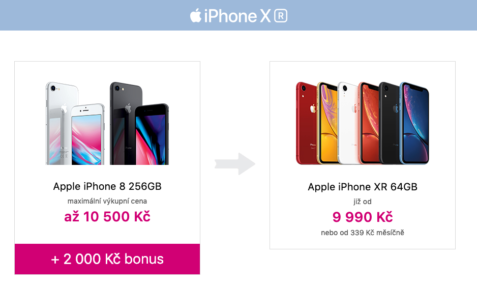 Za starý iPhone 8 s 256 GB paměti získáte výkupem až 10 500 Kč, v případě dobrého stavu. Poté si můžete pořídit třeba iPhone XR s 64 GB již od 9 990 Kč anebo si jej vzít za 339 Kč měsíčně na splátky.