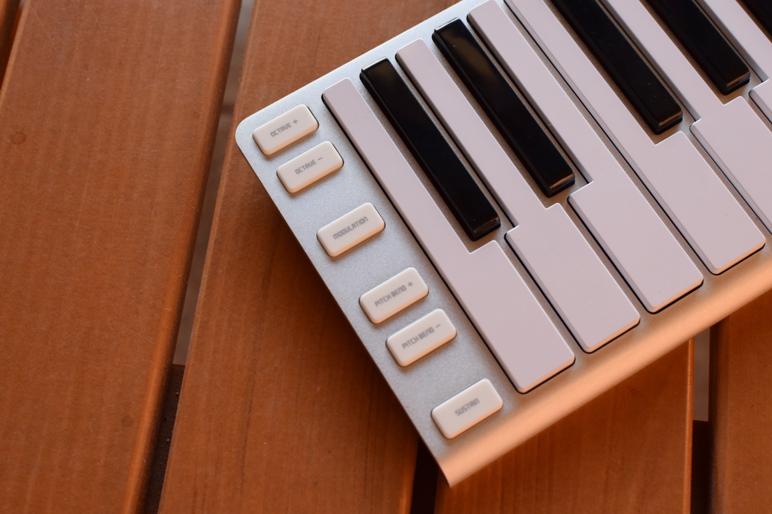 Do rukou se mi dostala konkrétně varianta MIDI klaviatury se 37 klávesami standardní velikosti (tedy 3 oktávy), které jsou už na první pohled skutečně tenké. Kromě nich pak na klaviatuře naleznete na levém boku šestici gumových tlačítek pro rychlé a snadné ovládání tónů. Jedná se konkrétně o tlačítka Octave + a – sloužící pro posunutí kláves o oktávu výše či níže, dále Modulation pro změnu stávající tóniny do jiné., Pitch bend + a -, které laicky řečeno přehrávaný tón “zvlní” a to buď směrem nahoru nebo směrem dolů, a nakonec tlačítko Sustain, které slouží pro udržení určitého tónu “na pozadí” dalších přehrávaných tónů. Vraťme se ale ještě chvíli k samotným klávesám. Ty se totiž mohou pochlubit skvělou dotykovou citlivostí či aftertouch, tedy funkcí umožňující i po stisknutí kláves dodatečně tlakem ovlivňovat výsledný zvuk. Kombinovanými stisky tlačítek se pak lze jednoduše vrátit na výchozí hodnoty, které jste právě jednotlivými tlačítky změnili. Klaviatura je tedy v tomto směru propracovaná do nejmenšího detailu.