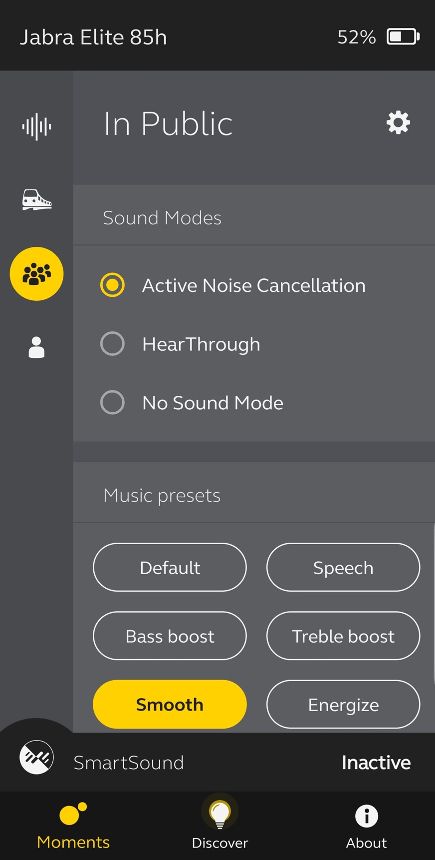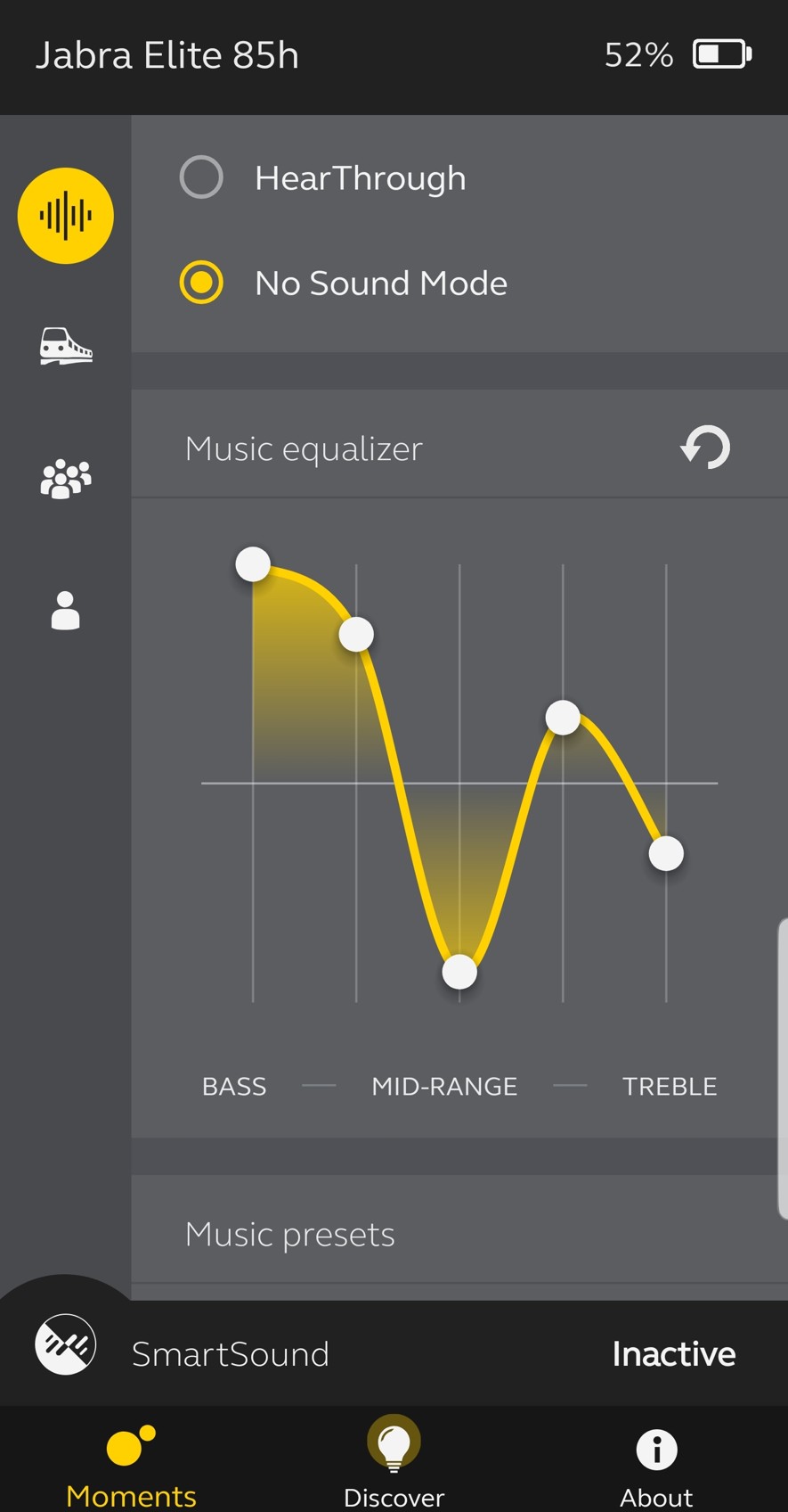 Zaktivování sluchátek je velmi jednoduché. Stačí je vydělat z pouzdra, rozložit a uvést ušní násady do správné polohy. Poté je třeba nainstalovat aplikaci Jabra Sound+ z App Store nebo Google Play. Aplikaci následně zapnete, vyberete sluchátka Jabra Elite 85H a máte vyhráno. Přidanou hodnotou těchto sluchátek je právě zmíněná aplikace. Ta je totiž velmi košatá a díky ní je svým způsobem na vás, jak sluchátka budou hrát. V hlavní nabídce máte na boku jakési 4 profily. Můj moment, V soukromí, V dopravě, Na veřejnosti. Jakmile na něj kliknete, zvuk se automaticky přepne do tohoto režimu. V něm jej pak můžete nadále upravovat. V každém z těchto čtyř režimů je nabízena možnost aktivování ANC, možnost slyšet ve sluchátkách svůj mluvený projev díky funkci HearThrough nebo No Sound Mode, při kterém pouze záleží, jak sluchátka nasadíte. Dále je zde ekvalizér, kde můžete manuálně upravovat basy, mid-range a treble. Pokud se tedy vyznáte, můžete zvuk sluchátek přizpůsobit obrazu svému. Pro nás ostatní jsou tam profily Speech, Bass Boost,Treble Boost, Smooth a Energize, které mají na ekvalizéru přednastavené hodnoty.