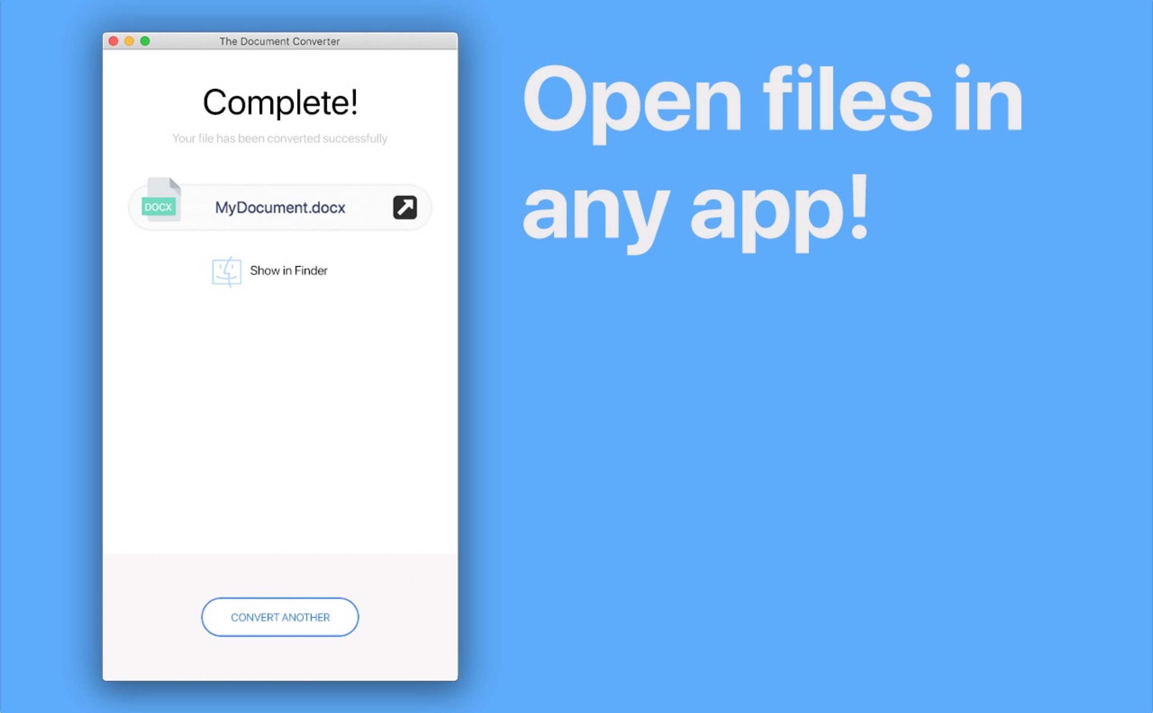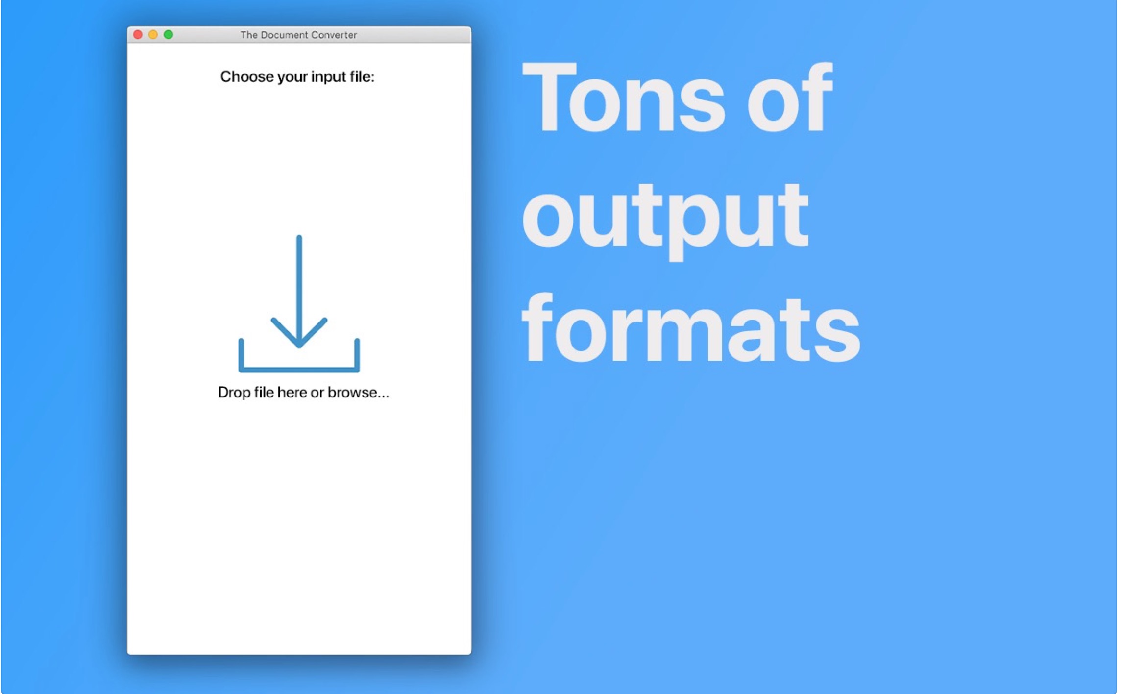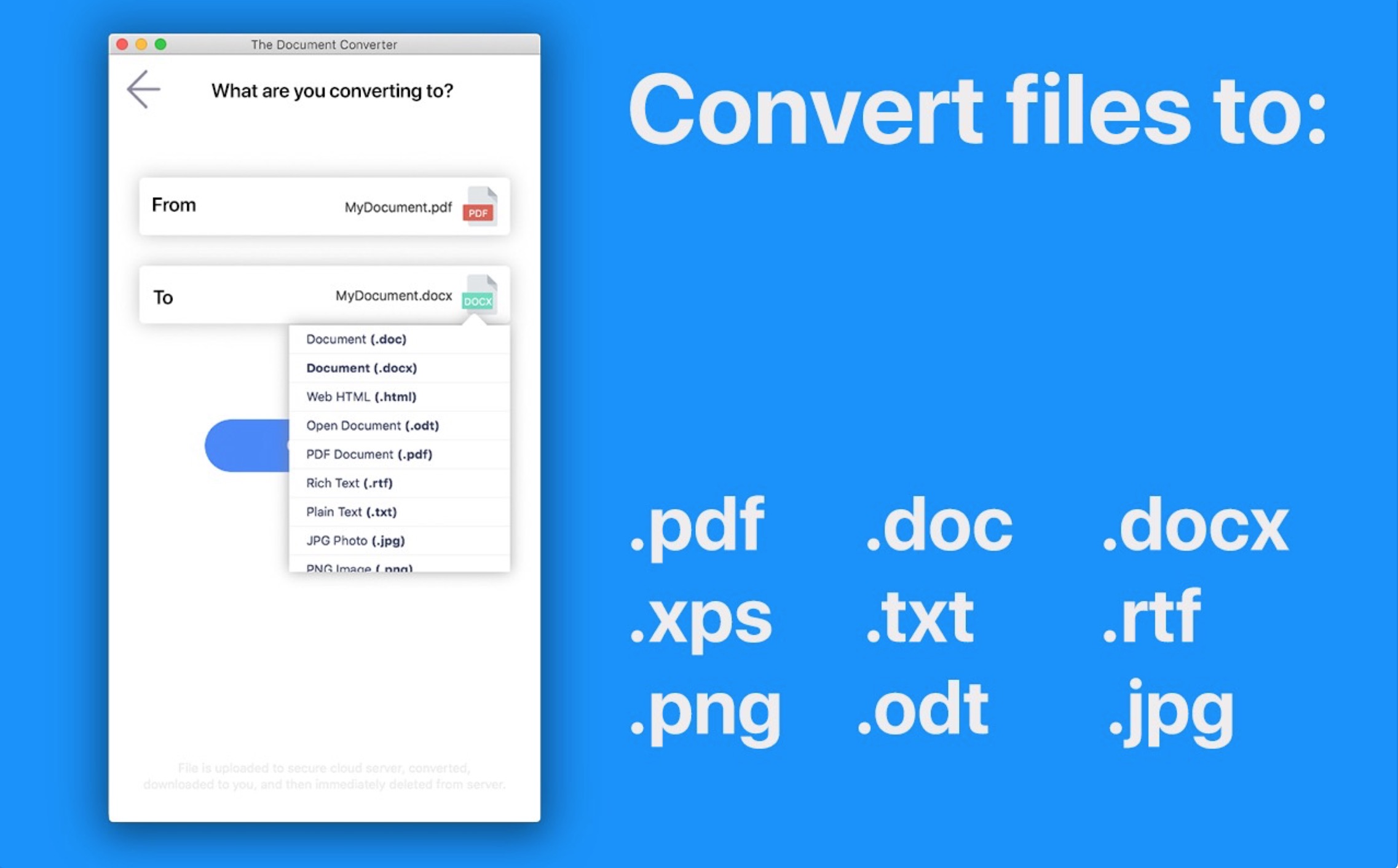 Převeďte své soubory do téměř všech hlavních formátů dokumentů! The Document Converter dokáže převést téměř jakýkoli dokument, obrázek nebo ebook na: DOCX (kompatibilní s Office a Pages), DOC, HTML, ODT, PDF, RTF nebo TXT.
