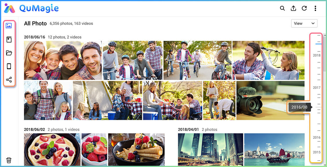 Po otevření aplikace QuMagie se vám zobrazí nové okno, ve kterém najdete (kromě vzorových fotografií) fotky, které máte na vybraném místě na vašem NASu uložené. Můžete si vybírat z několika režimů zobrazování, včetně rozličných možností filtrování a seřazování obsahu. Skrze uživatelské rozhraní je možné nahrávat nové fotografie, které pak můžete libovolně upravovat do alb a jiných seznamů, resp. složek. Jednotlivé fotografie je také možné označovat a klasifikovat do konkrétních seznamů, které jsou následně snadno k zobrazení.