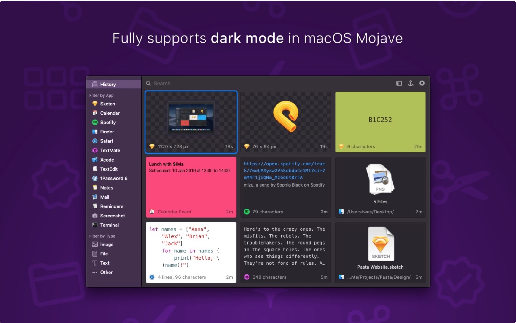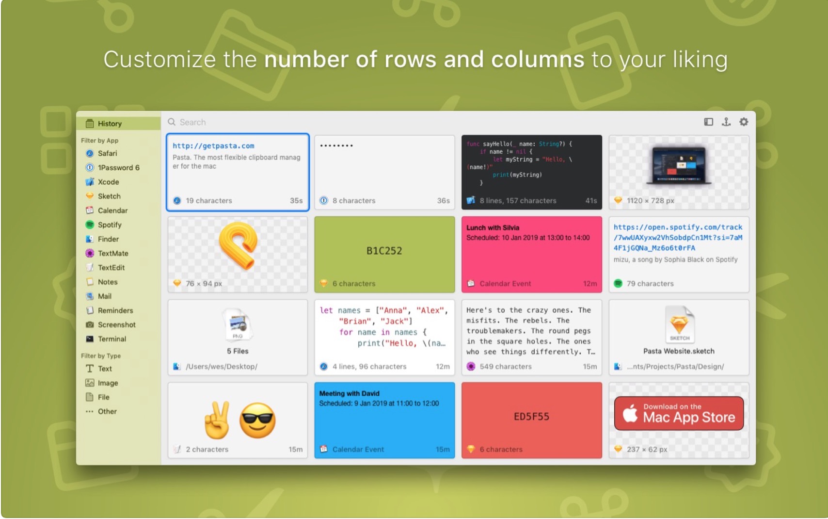 Jednoduchých a užitečných nástrojů je opravdu málo. Mezi ně se řadí i Pasta, jenž díky svému přehlednému designu umožní snadno a rychle najít již zkopírovanou věc, a to všechno na jednom místě. Nastartujte svou produktivitu.