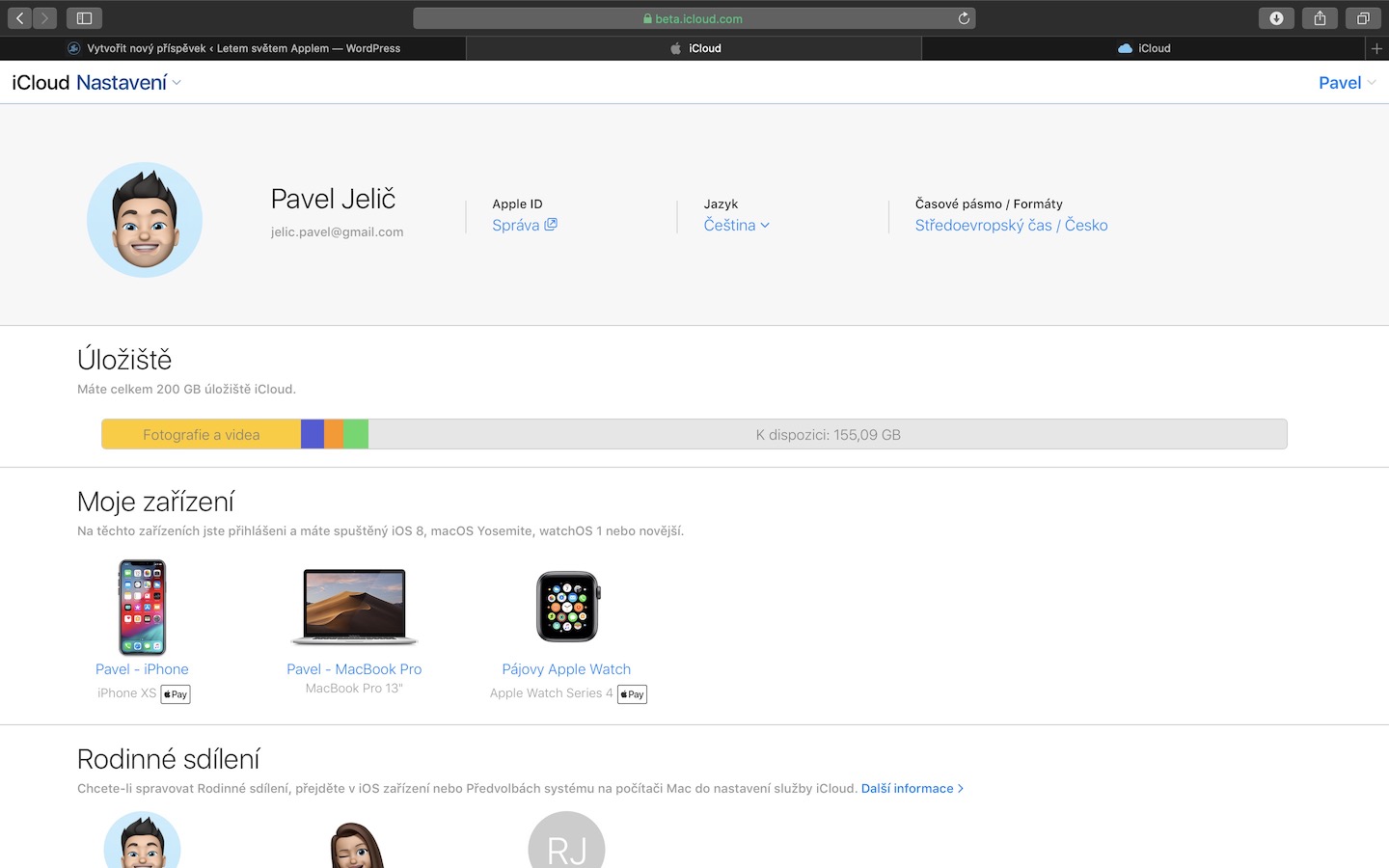 V nové webové verzi iCloudu nyní navíc můžete jednoduše přejít do nastavení vašeho účtu. Zde si můžete nastavit a zobrazit veškeré údaje o vašem účtě, také si ale můžete zobrazit využití úložiště na iCloudu, či informace o všech vašich zařízeních. Na samotném spodku stránky se nachází informace o rodinném sdílení. Možná vás napadlo, že původní aplikace Najít iPhone bude v nové verzi iCloudu nahrazena aplikací Najít. Tento krok se samozřejmě očekává, prozatím však i v beta verzi zůstává název aplikace nezměněný.