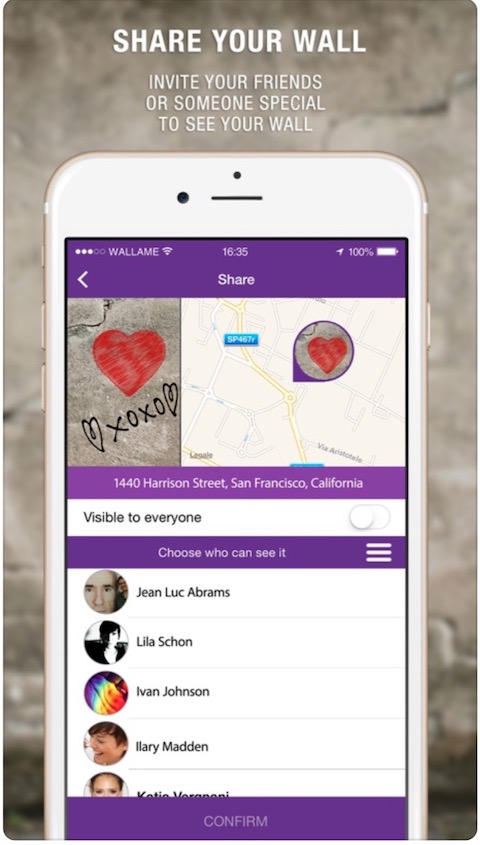 WallaMe je originální sociální platforma, jejíž uživatelé mohou zanechávat „neviditelné“ virtuální vzkazy na zdech po celém světě. Po instalaci aplikace zkrátka jen namíříte fotoaparát svého iPhonu na libovolnou zeď a začnete psát, co máte na srdci. Ke svému vzkazu můžete přidat i samolepku z galerie aplikace. Součástí WallaMe je i mapa s přehledem dostupných vzkazů od ostatních uživatelů.