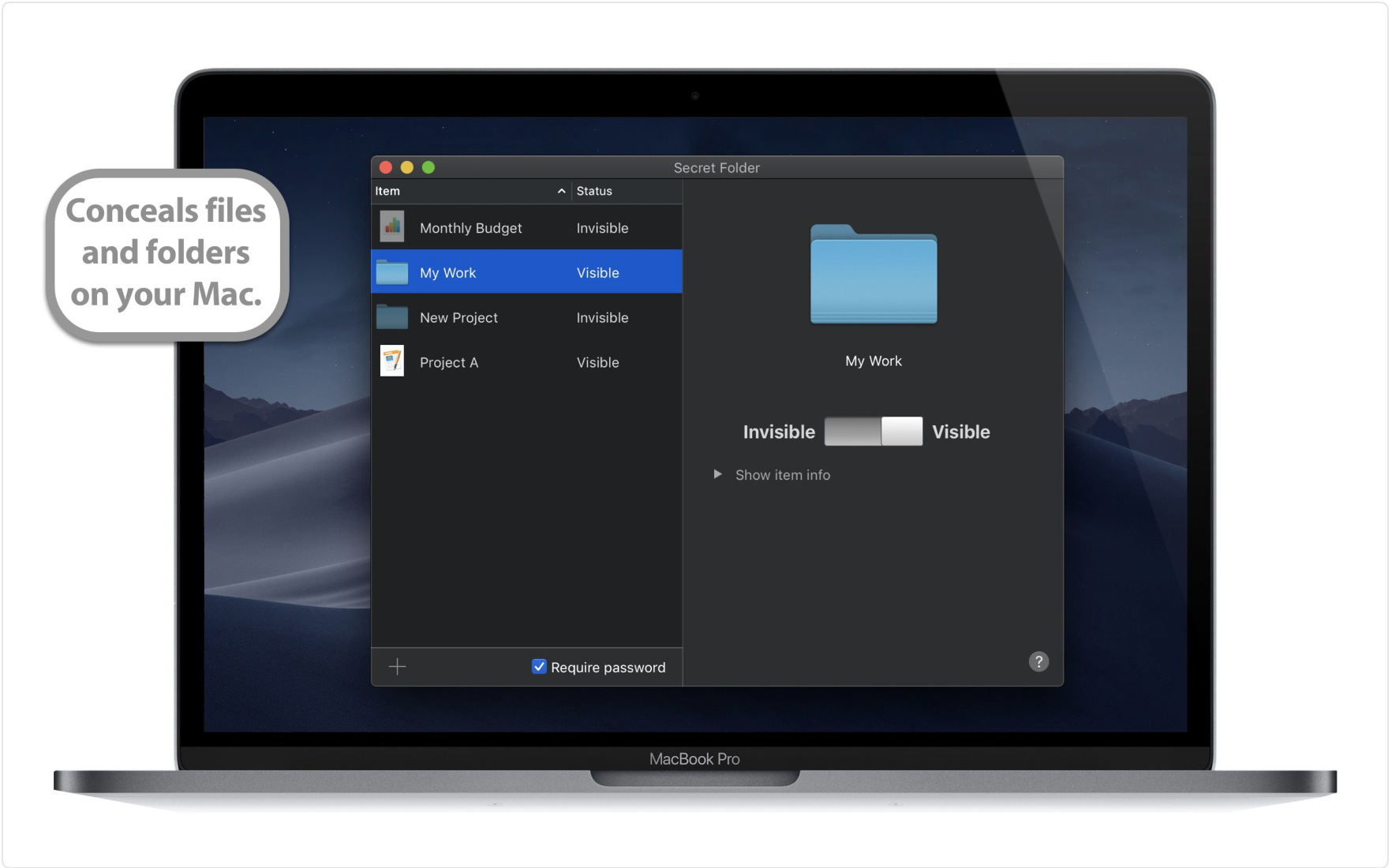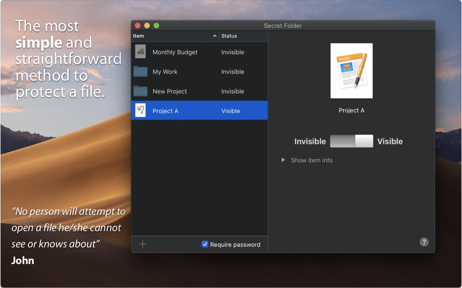 Dělíte se doma o Mac nebo je často půjčujete do rukou nepovolaných osob. Secret Folder vám pomůže s tím, aby k souborům nebo složkám, na nichž vám zaleží nebylo zvědavým lidem povolen přístup. Ochraňte vše snadno a jednoduše heslem.