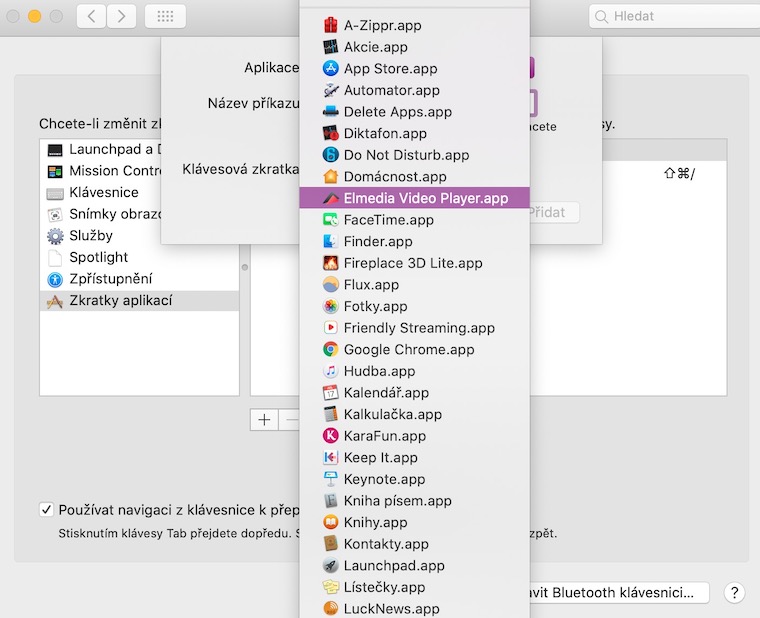 Tímto způsobem můžete v Předvolbách systému nastavit vlastní klávesové zkratky pro klávesnici jako takovou, Spotlight, zpřístupnění a další položky systému. Nejvíce možností v tomto směru skýtá sekce „Zkratky aplikací“, je ale potřeba si vždy v dané aplikaci zjistit přesné znění příkazu, ke kterému chcete vybranou zkratku přiřadit.