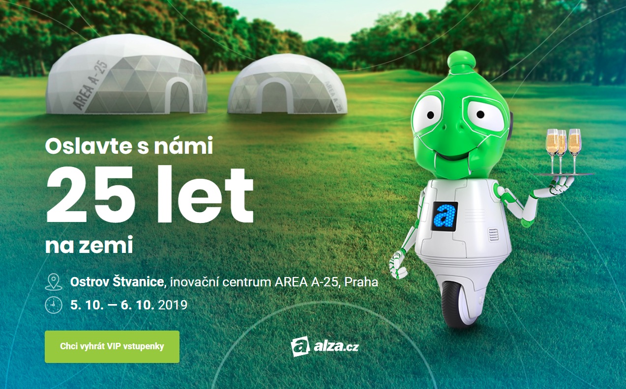 Firma v rámci dvoudenních oslav na Štvanici připravuje na první říjnový víkend speciální mimozemskou zónu, nazvanou Inovační centrum planety Alza Area A-25, plnou nejnovějších technologií, zábavy a vybraných (nejen technologických) pochoutek – ve třech obřích zastřešených blobech s tematickým názvem Area A-25 nebudou chybět produkty zastupující gaming, VR (vč. např. 8K VR, haptických rukavic atd.), AR, hologram, 3D tisk 3v1 (CNC, Laser engraving a 3D tisk v jednom stroji), smarthome, smartsport nebo elektromobilitu. Zajímavé expozice doprovodí pestrý program vhodný i pro malé pozemšťany.