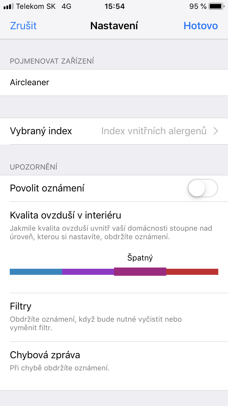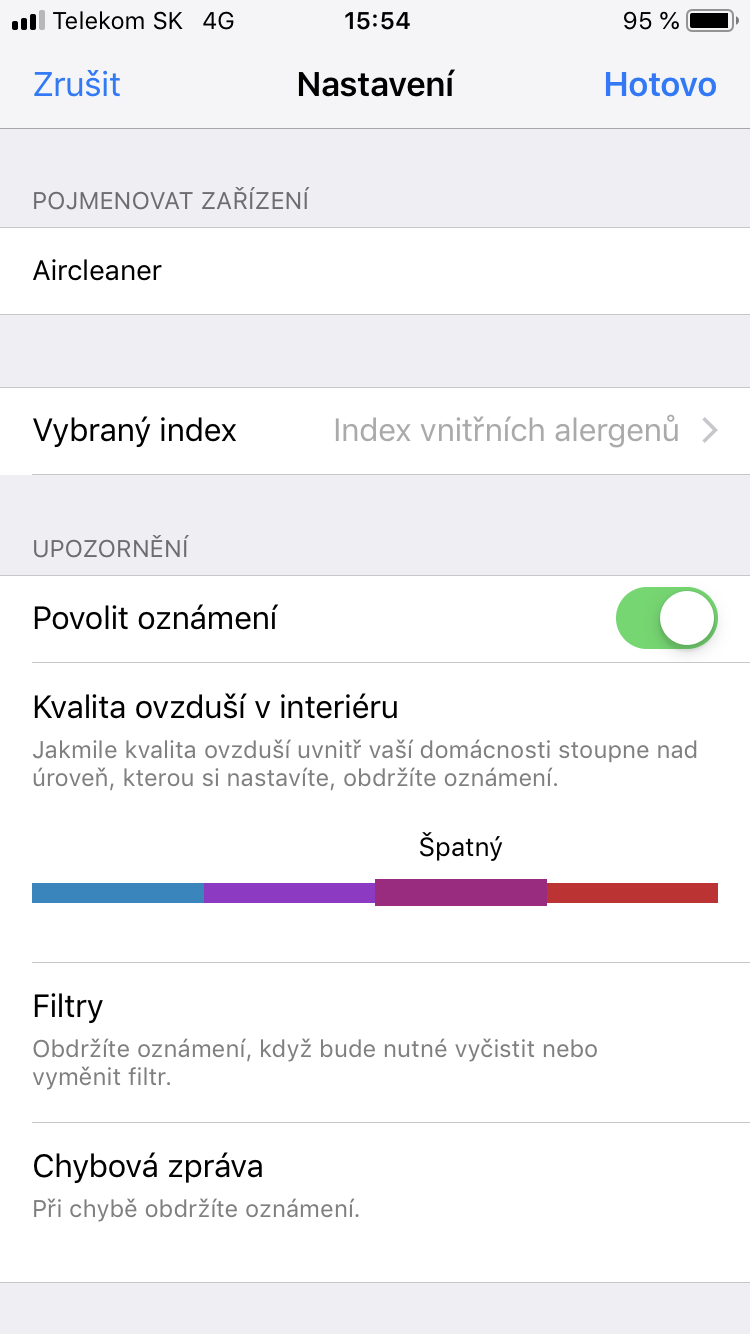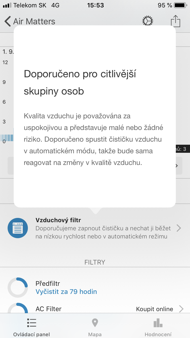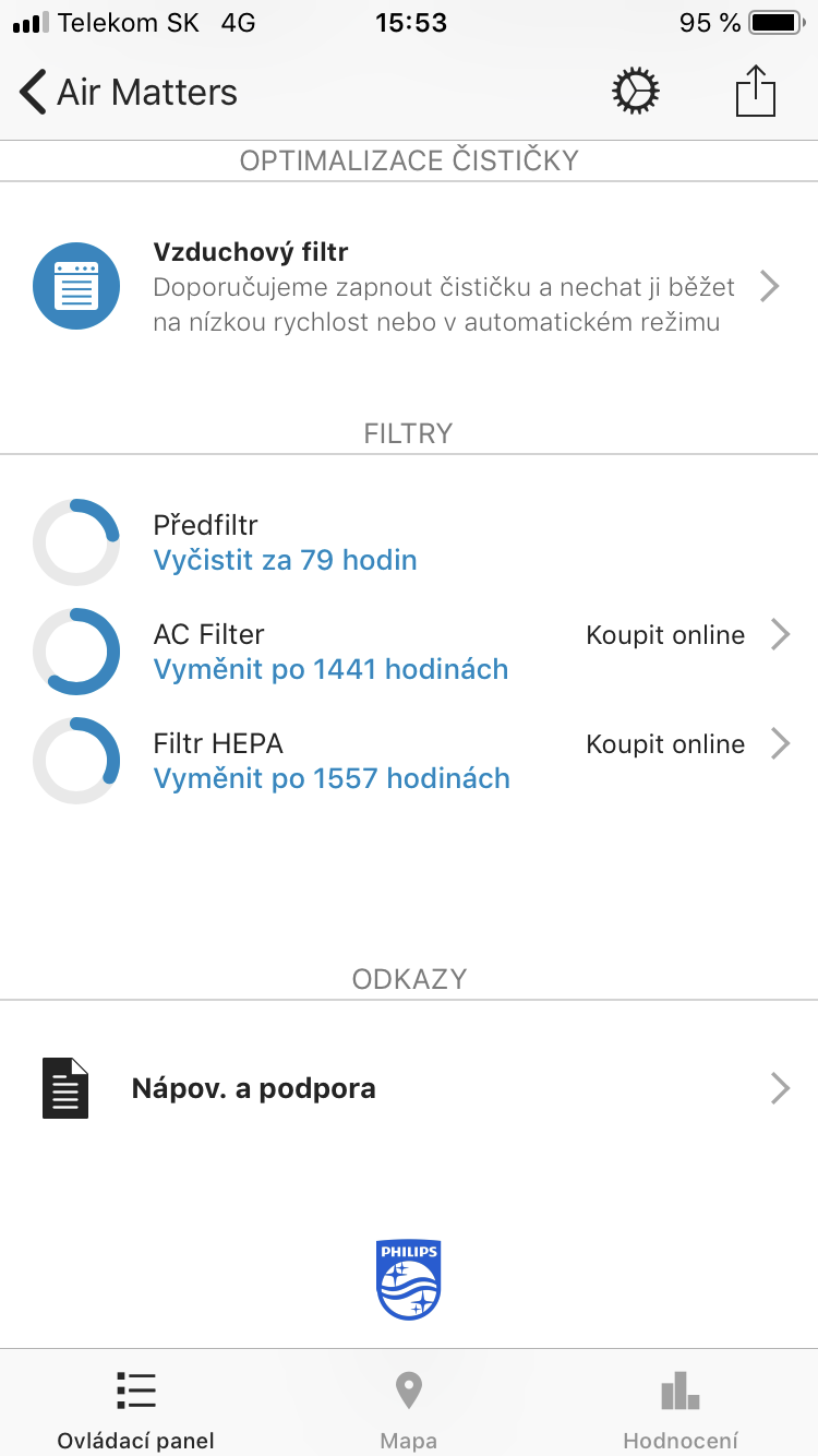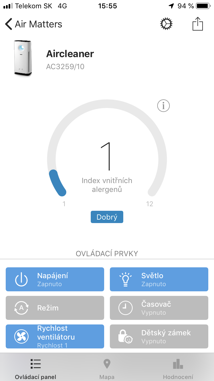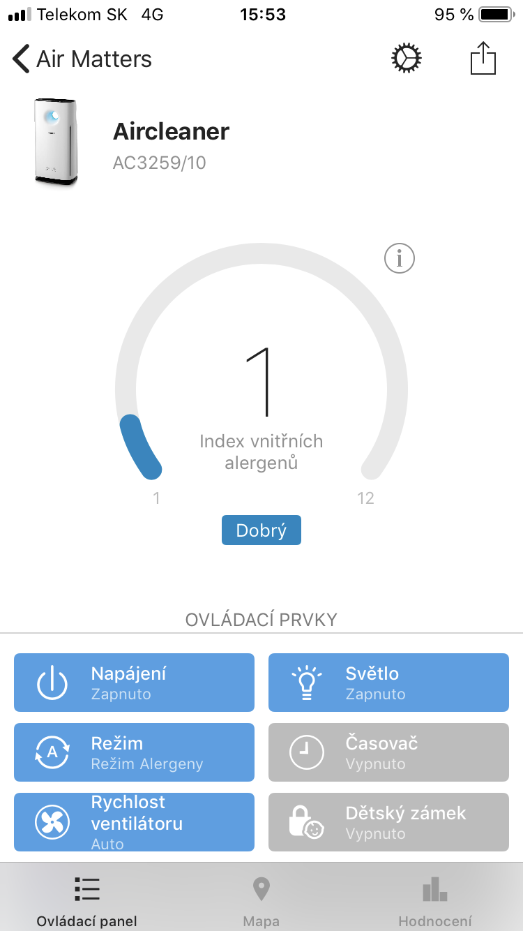 Pokud máte čističku vzduchu s podporou Air Matters, stečí ji pomocí Wi-Fi připojit k aplikaci a okamžitě máte přehled nad tím, jakou kvalitu vzduchu čistička měří přímo ve vašem bytě nebo domě. Můžete si nechat zasílat notifikace v případě, kdy kvalita ovzduší klesne pod požadovanou hodnotu. Pomocí aplikace můžete nastavit vše, co lze udělat také přímo na čističce, a ještě mnohem víc. Můžete tedy čističku zapnout/vypnout, změnit její režimy, rychlost ventilátoru, nastavit podsvícení, změnit časovač anebo aktivovat dětský zámek. Máte samozřejmě také přehled o tom, jaký je index vnitřních alergenů nebo jaký je počet prachových částic v ovzduší. Vše funguje zcela intuitivně a jednoduše, čemuž pomáhá také fakt, že je aplikace kompletně v češtině.