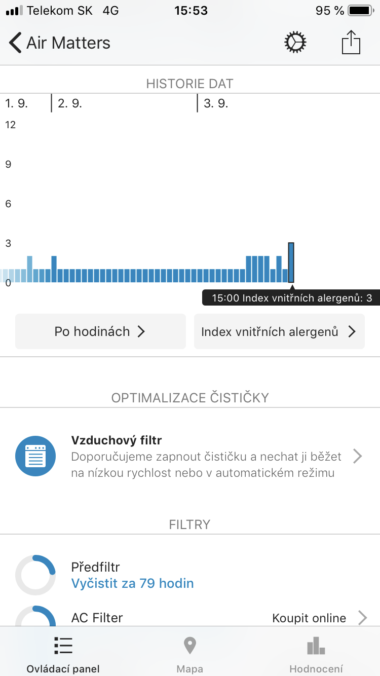 V aplikaci také vidíte, jak jsou na tom jednotlivé filtry, tedy předfiltr, který pouze čistíte vodou, AC filtr a HEPA Filtr, které musíte měnit za nové. Přehledně víte, kolik hodin vám ještě filtry budou na 100% fungovat a kdy byste je již měli vyměnit nebo vyčistit. O výměnu, čištění si umí říct i sama čistička, ovšem jen v případě, kdy již něco vyžaduje. Blížící se nutnost výměny můžete monitorovat pouze v aplikaci samotné. Samozřejmostí je pak historie dat, kde přehledně vidíte množství alergenů, respektive jejich index nebo množství prachových částic. Máte také možnost nastavit automatický režim, kdy čistička svou rychlost reguluje pomocí senzoru, jenž snímá okolní znečištění vzduchu a automaticky tak zvyšuje a snižuje intenzitu ventilátoru. Čističku lze ovládat také pomocí Siri a to prostřednictvím pokynů, které si sami nastavíte. Bohužel chybí podpora homekitu, ovšem tu má stále ještě jen minimum všech produktů, a tak vybírat čističku vzduchu zrovna podle podpory homekitu mi příliš nedává smysl.