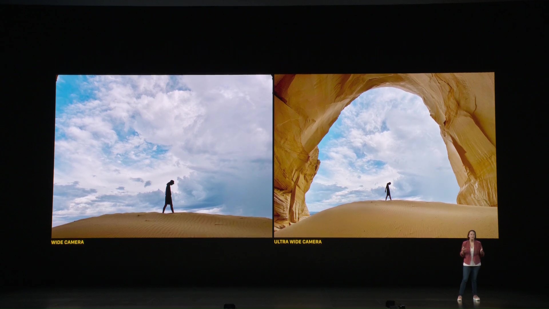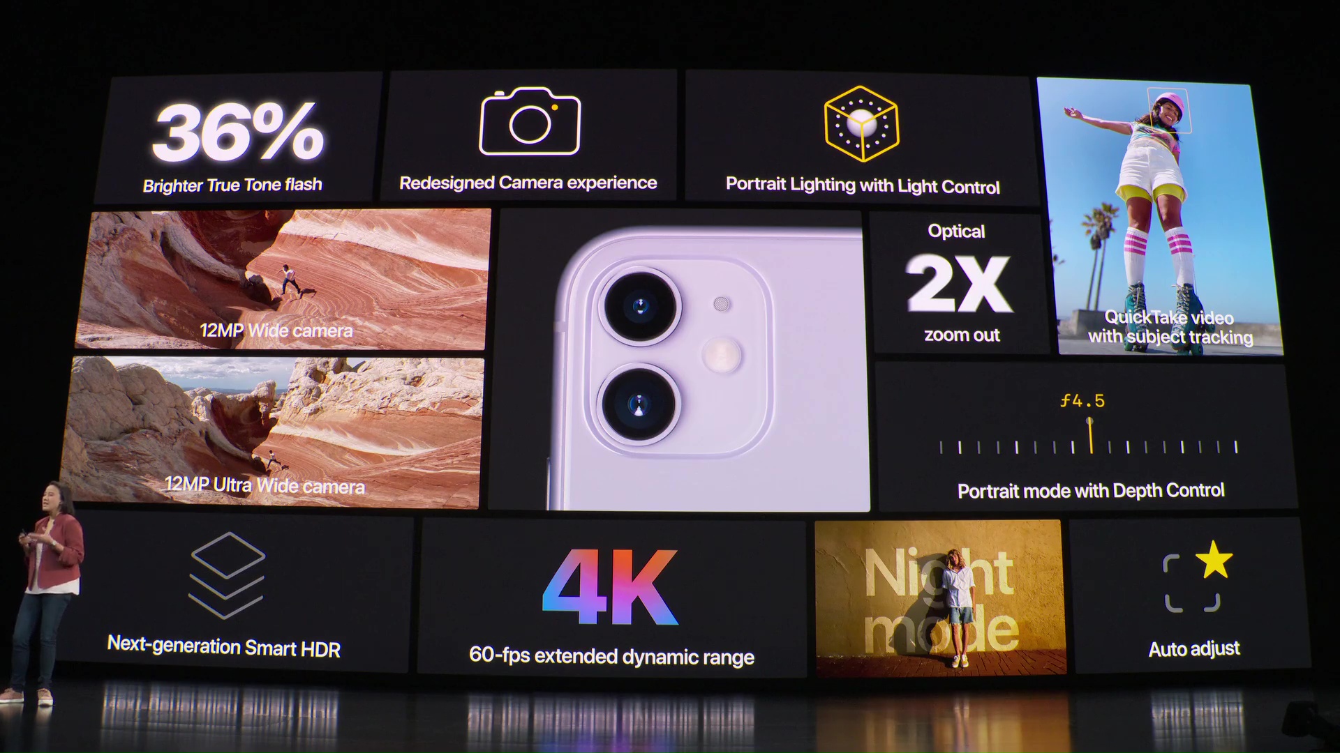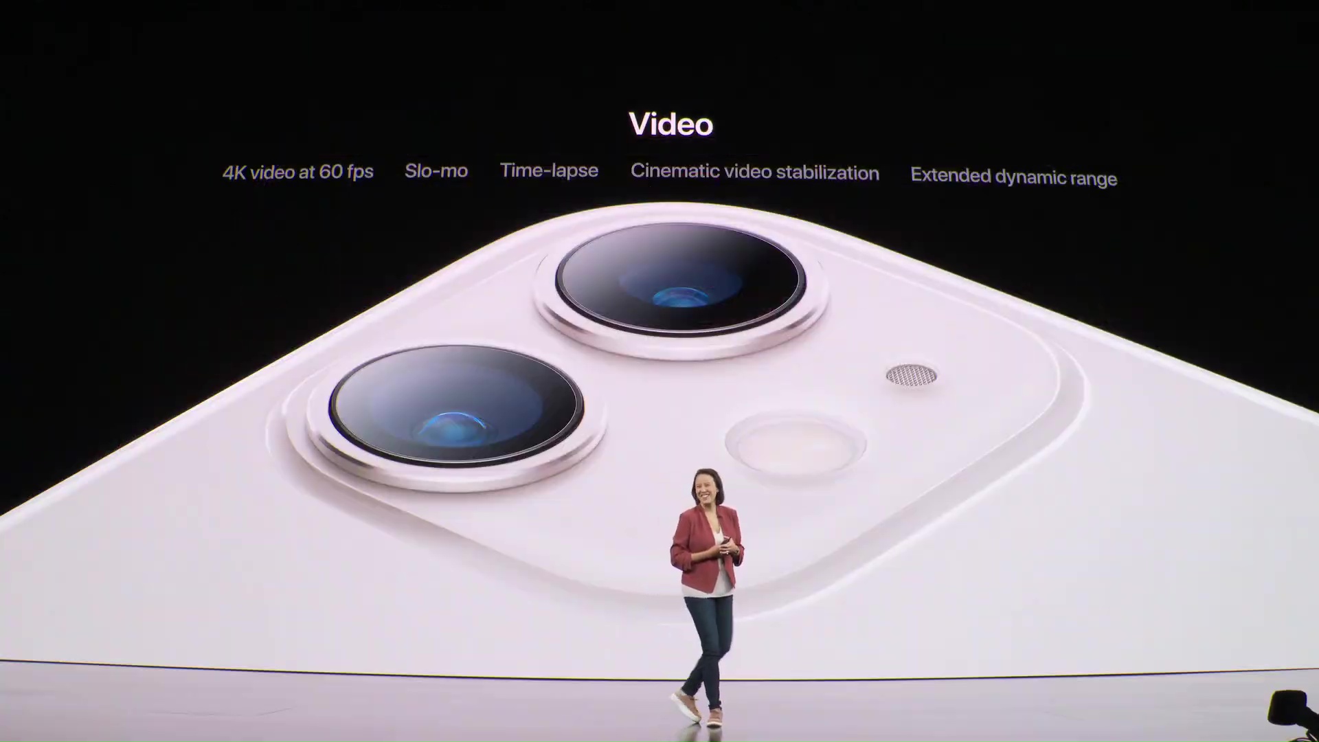 Fotoaparát se dočkal také masivního přepracování – samotné jeho představení trvalo několik dlouhých minut. Na první pohled poznáte změnu v tom, že nyní na zádech iPhonu 11 najdete hned dvě čočky. Jedna z nich je klasická širokoúhlá, disponuje 12 Mpix snímačem a má clonu f/2.4. O mnoho zajímavější je druhá čočka z dvojice, která nese označení ultra-širokoúhlá a má clonu f/1.8. Ta má také 12 Mpix a vyniká především ve focení panoramat. Obě čočky navíc dokáží spolupracovat společně. Při focení využívají nespočtu různých akcí, aby z fotografie udělaly mistrovské dílo – a letos je těchto akcí v pozadí o čtyři navíc. Samozřejmostí je také podpora portrétového módu, který není vázaný jen na obličeje, ale dokáže vyfotit také zvířata či jiné objekty. Při točení videí můžete mezi oběma čočkami přepínat a využívat přiblížení. Přední kamera poté disponuje také 12 Mpix objektivem, se kterým můžete dělat opravdové divy – nově je k dispozici například točení 4K videí v 60 FPS.