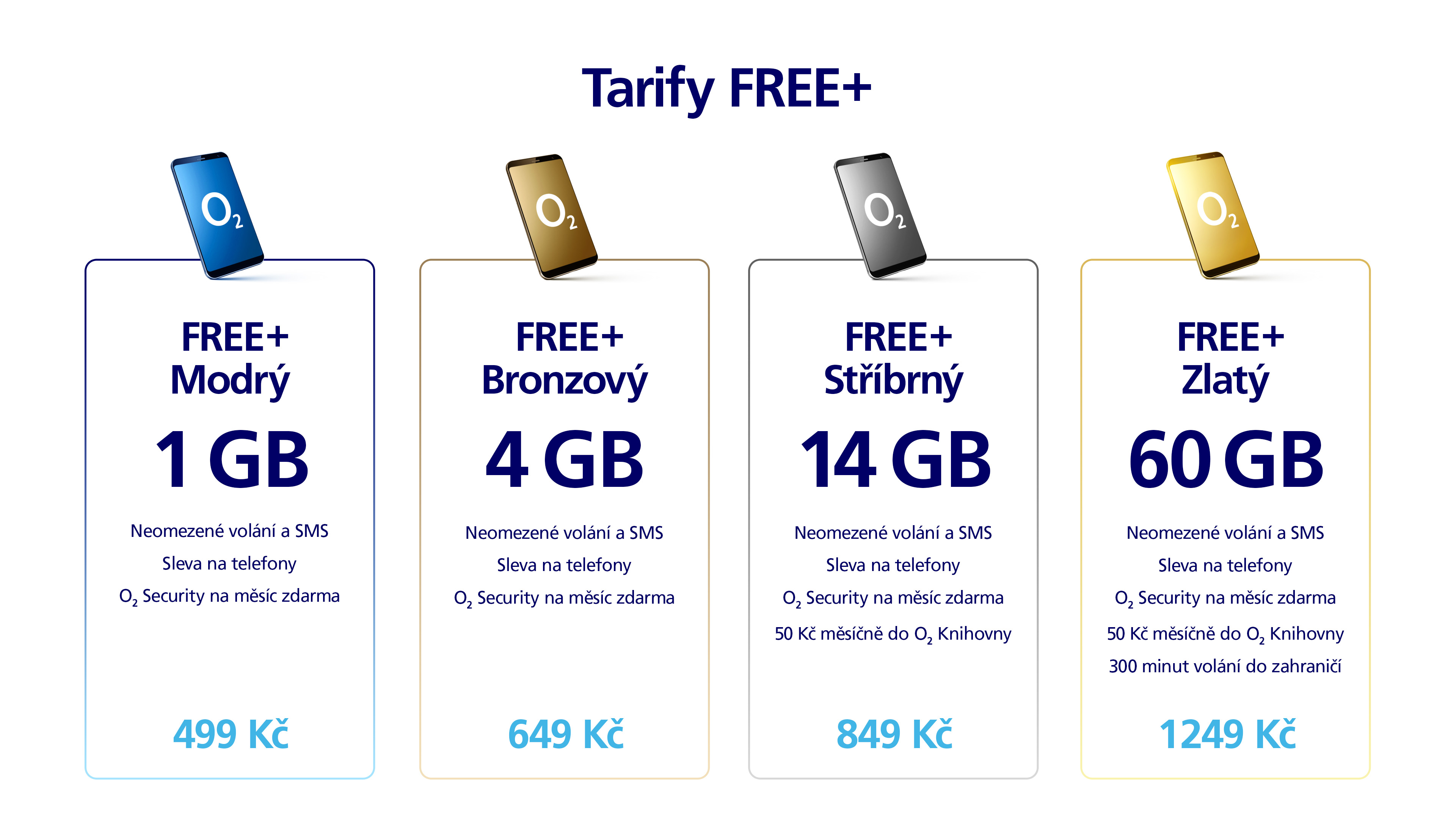 Za zmínku rozhodně stojí i změny v oblíbených tarifech skupiny FREE+. Ty se od poloviny září dočkají výrazného navýšení dat v tarifech s neomezeným voláním. V tarifu FREE+ Bronzový O2 zvyšuje objem dat o čtvrtinu na 4 GB a jeho cenu snižuje o sto korun. “ Do tarifu FREE+ Stříbrný přidáváme více než dvojnásobek dat – zákazníkům nově dáme 14 GB dat, aniž bychom měnili jeho cenu. Tento objem dat bohatě stačí i těm, kteří na internetu v mobilu tráví i několik hodin denně,“ říká generální ředitel O2 Jindřich Fremuth.V tarifu FREE+ Zlatý operátor O2 objem dat dokonce zpětinásobí na 60 GB, a zákazníkům tak nabídne nejnižší cenu za gigabyte. O2 přidá dvojnásobek dat také do základního tarifu FREE+ Modrý a nabídne tak nejdostupnější tarif na trhu s neomezeným voláním a dostatečným objemem dat pro ty, kteří s chytrým telefonem začínají .