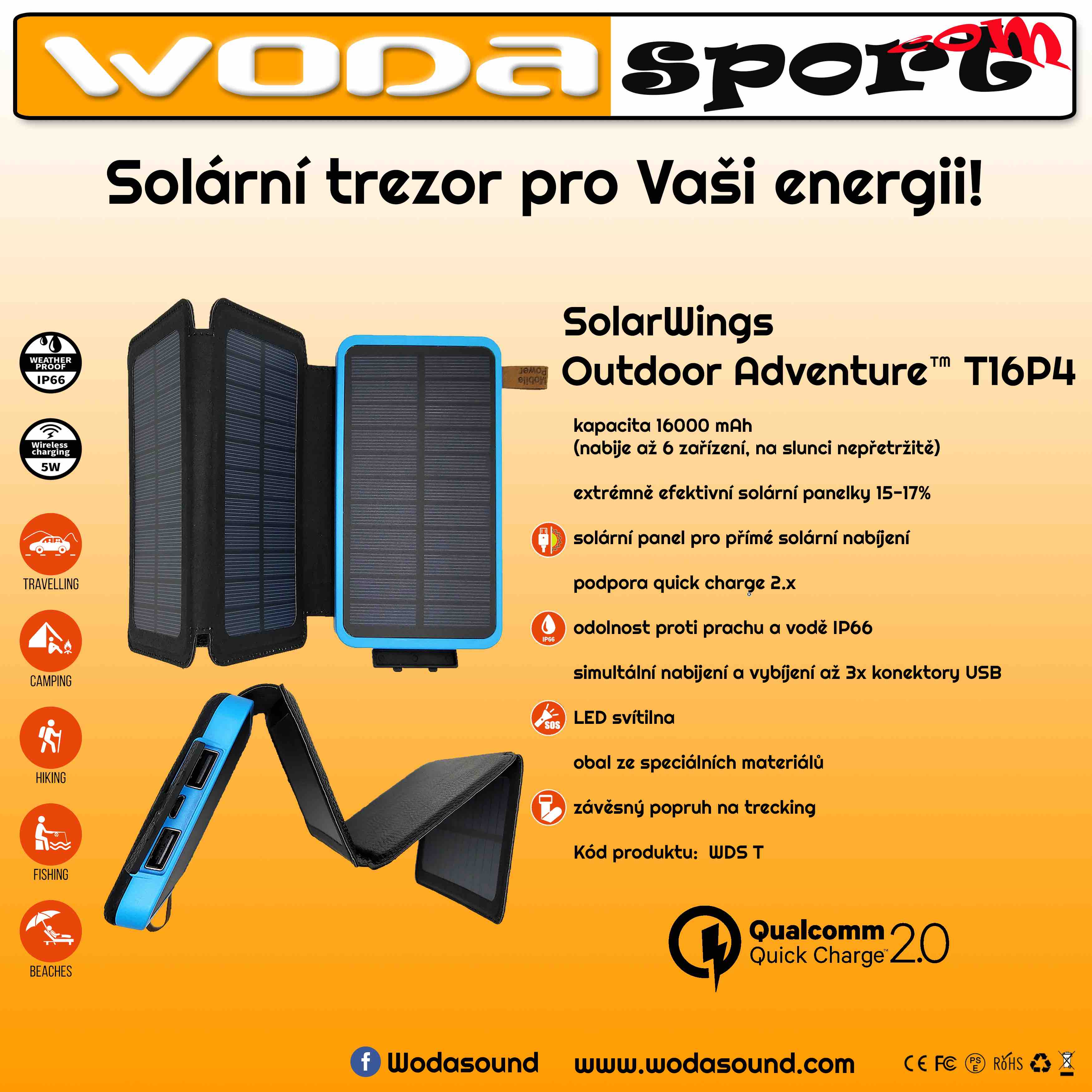 Jako další představenou novinku nelze opomenout SolarWings T16P4 powerbanku sice s nižší kapacitou baterie, ale s rozkládacím solárním panelem schopným nepřetržitého nabíjení ze solární energie. Jak uvedl specialista a vývojář firmy Jan Veselý: „Je podstatným pokrokem na poli powerbank, že se nám podařilo vtěsnat 4x složený solární panel s účinností 15-17 % do designu powerbanky a tím při zachování poměrně lehké váhy a standardní přenosné velikosti vytvořit produkt, který potřebuje pro svou činnost pouze solární energii pro přímé nabíjení / dobíjení. „ Samozřejmě možnost dobíjení ze sítě zůstala zachována při použití technologie QCH 2.x.