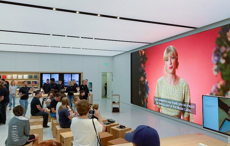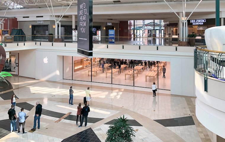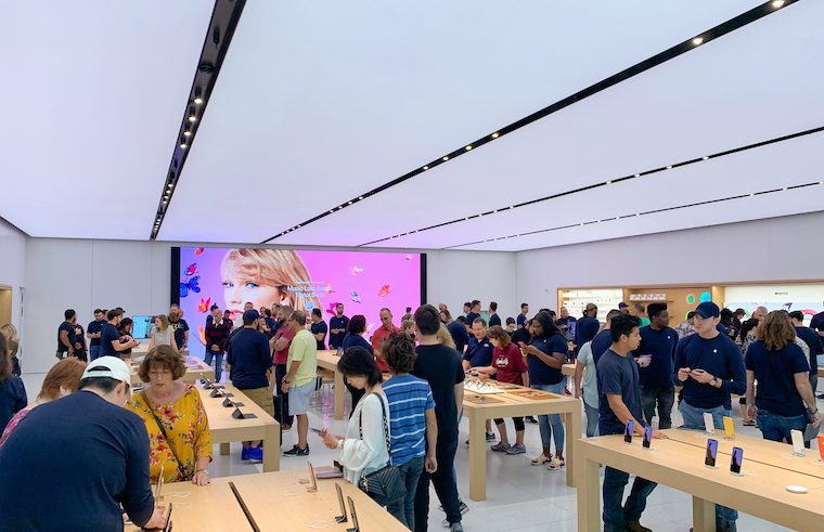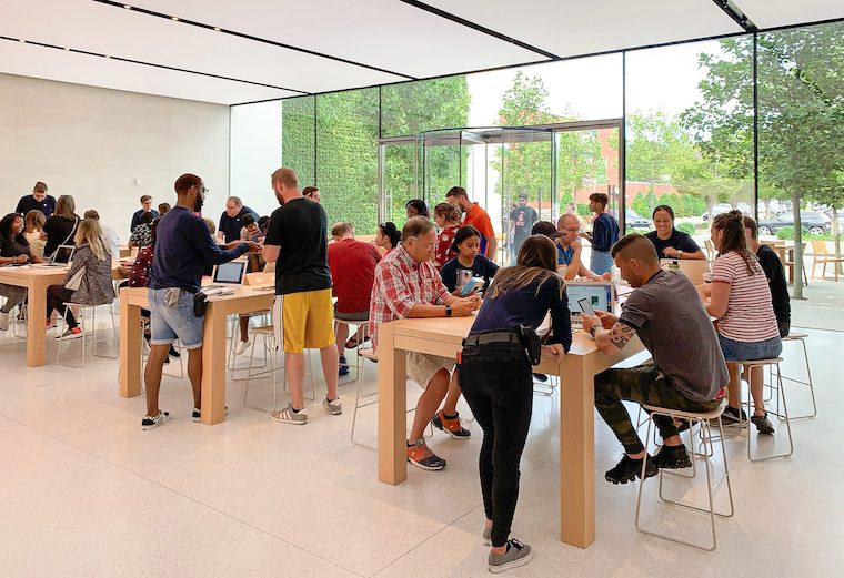 Prostor před obchodem je vybaven dřevěnými stoly a židlemi, o přirozený stín se starají vzrostlé stromy. Návštěvníci, kteří do prodejny přicházejí ze zmíněného prostoru, se po vstupu ocitnou v prostorech, kde probíhá školení, trénink, a kde jsou poskytovány služby Genius Baru. Videostěna pak tvoří přirozenou bariéru mezi jednotlivými částmi prodejny.Vypadá to, že ani po odchodu Angely Ahrendts Apple na programy Today at Apple a vše, co je s nimi spojené, nehodlá rezignovat. Nově rekonstruované i znovu otevřené prodejny se mohou pyšnit designem, jehož návrh vzešel ze spolupráce Angely Ahrendts s Jonym Ivem, a Apple se snaží prostory svých prodejen ještě více zvětšovat. 20. září se očekává otevření dalších pěti poboček prodejen Apple, a to v New Jersey nebo třeba v Minnesotě.