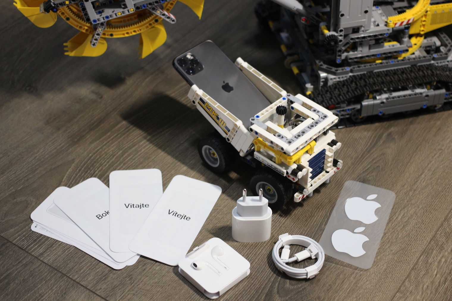 Samotná krabička s telefonem váží víc, než tomu bylo u jejího předchůdce. Na tom má samotný telefon jen minimální podíl. Sice je oproti iPhone Xs o pár gramů těžší, ale největší rozdíl je v nabíječce. Apple totiž poprvé v historii přidal do telefonu takzvanou rychlonabíječku, respektive stejnou nabíječku, kterou najdete u iPad Pro. Ta je přece jen výrazně těžší než doposud dodávané základní nabíječky. Kromě té se však v balení nenachází nic nezvyklého, tedy kromě USB-C – Lightning kabelu, který náleží již zmíněné nabíječce.