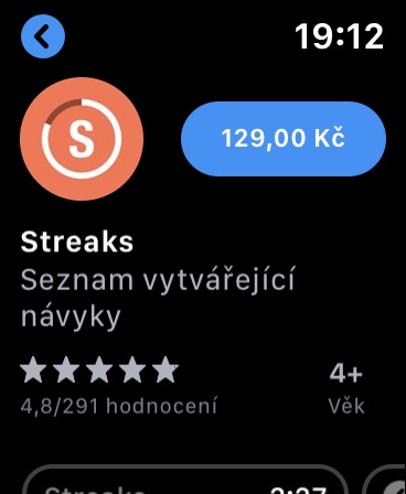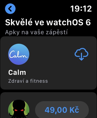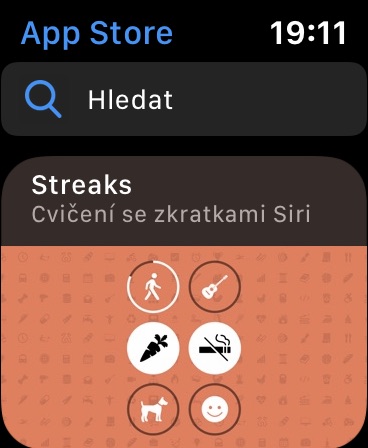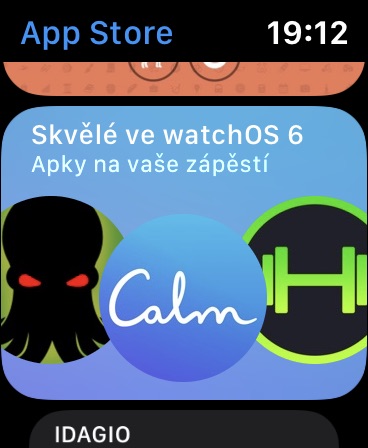 Jednou z nejvýznamnějších funkcí operačního systému watchOS 6 je vlastní App Store. Stačí stisknout korunku Apple Watch a v seznamu aplikací vyhledat důvěrně známou ikonku s bílým „A“ v modrém kroužku. App Store v Apple Watch je naprosto plnohodnotným softwarovým obchodem. Po jeho spuštění můžete procházet seznamy nejpopulárnějších aplikací a další seznamy, vyhledávat v něm můžete za pomoci hlasového zadávání nebo psaní na displeji.