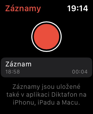Operační systém watchOS 6 obsahuje velmi zjednodušenou, ale užitečnou verzi aplikace Diktafon, známé z iOS. Stačí aplikaci otevřít a po klepnutí na červené tlačítko začít nahrávat. Pro ukončení pořizování záznamu stačí jen opět klepnout na červené tlačítko uprostřed displeje, a záznam se automaticky uloží.  Veškeré nahrávky se automaticky synchronizují přes iCloud, takže je najdete také ve svém iPhonu, iPadu, nebo třeba Macu. V aplikaci Diktafon pro Apple Watch si také všechny své hlasové záznamy můžete pohodlně přehrát.