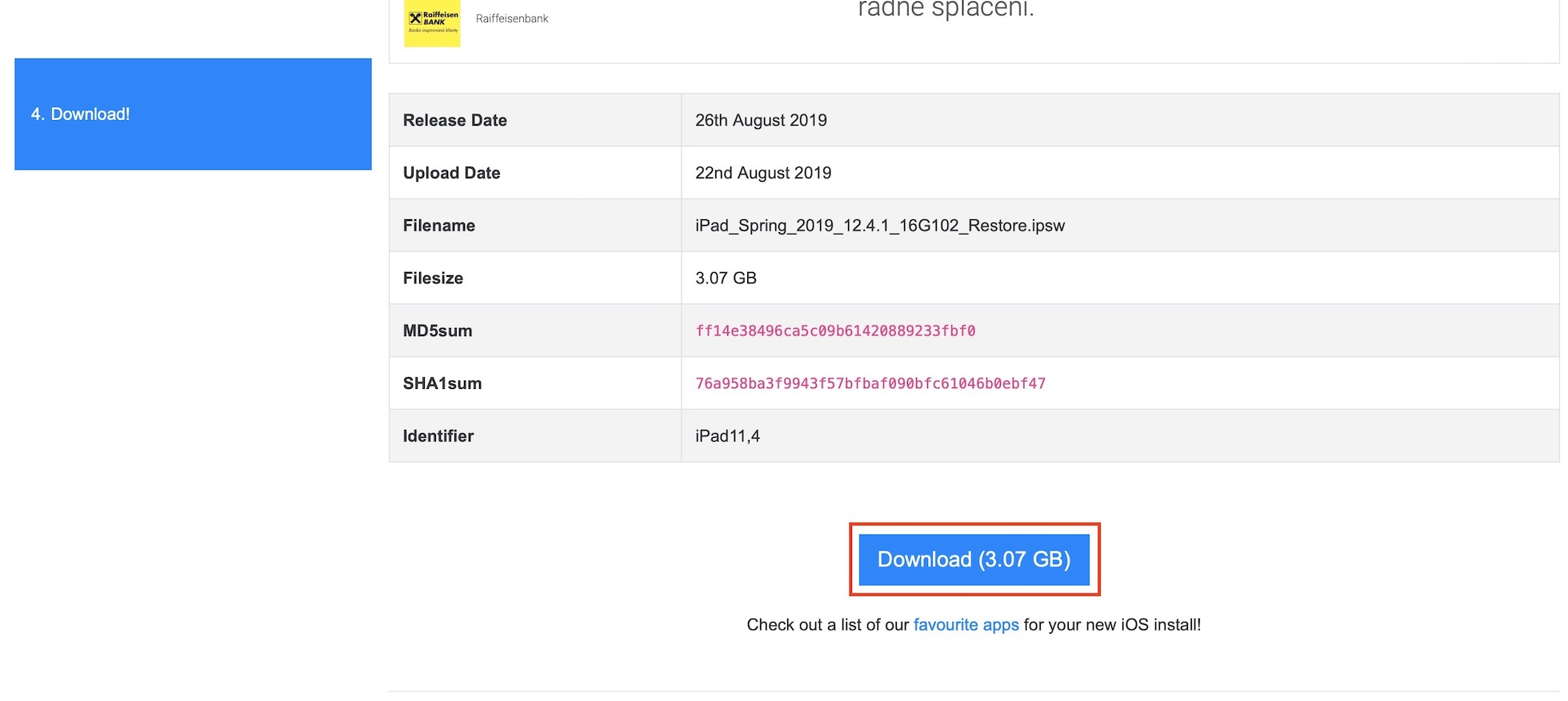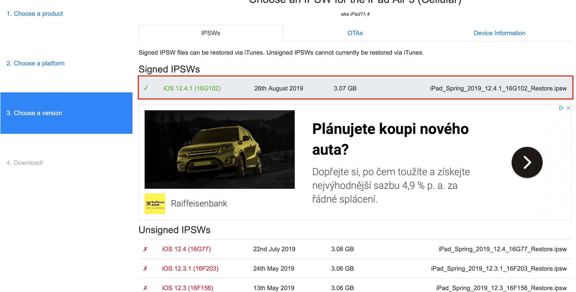 Než se pustíte do čehokoliv jiného, tak je nutné, abyste si z těchto stránek stáhnuli tzv. IPSW soubor pro váš model iPadu. Jakmile tedy na stránky přejděte, tak si v seznamu vyberte vaše zařízení, a poté vyberte poslední verzi iOS 12, kterou Apple podepisuje – momentálně tedy iOS 12.4.1. Jakmile poslední verzi rozkliknete, tak zvolte možnost Download a vyčkejte, dokud se celý soubor nestáhne. Stahování je samozřejmě závislé na rychlosti vašeho připojení k internetu a vzhledem k tomu, že některé soubory mohou mít i několik gigabajtů, tak může stahování nějakou dobu trvat.