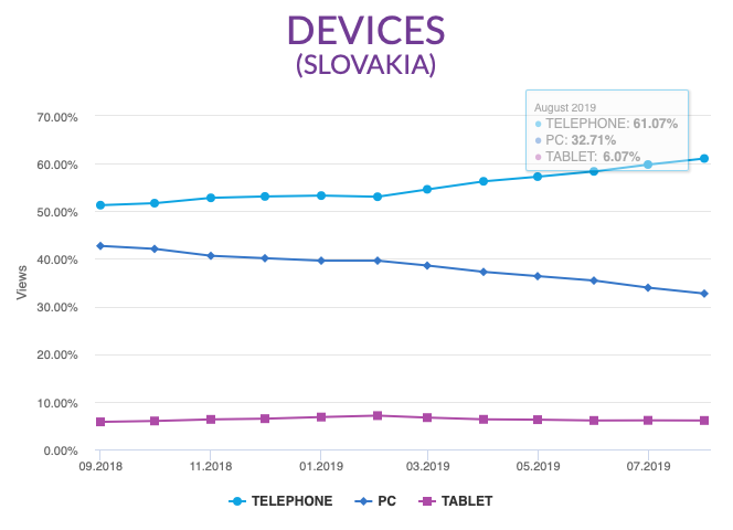 Na Slovensku je pak situace radikálně jiná, pro přístup k internetu zde používá tablet 6,07 %, počítač 32,71 % a smartphone 61,07 % uživatelů. Rozdíl mezi počtem uživatelů mobilních zařízení na Slovensku a v Česku je tedy téměř 20 % ve prospěch Slovenska. Je těžké odhadovat, čím je tento nepoměr způsoben, ve prospěch surfování na mobilním telefonu na Slovensku však hrají paušály operátorů, které jsou zde všeobecně levnější než v ČR.