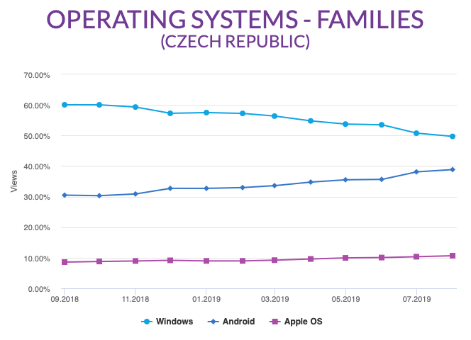 Bohužel je jasné, že uživatelé Apple OS budou tvořit v rámci obou zemí spíše minoritu, a tak poslední výsledky ze srpna 2019 mluví o tom, že operační systémy od Applu používá v ČR pro 10,66 %, Android 38,85 % a Windows 49, 71 % uživatelů. Na druhou stranu potěší fanoušky alespoň fakt, že v loňském září používalo Apple OS pouze 8,58 % uživatelů, což znamená meziroční nárůst o více než 2 %.