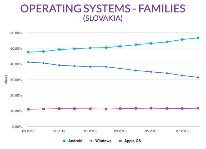 V rámci Slovenska vede s obrovským náskokem Android, který používá 56,64 % všech uživatelů, kteří se se svým zařízením připojují k internetu. Na druhém místě zastoupený Windows pak používá 31,35 % uživatelů a překvapivě operační systémy od Applu zde používá větší procento uživatelů než v ČR a to rovnou 11,61 %.
