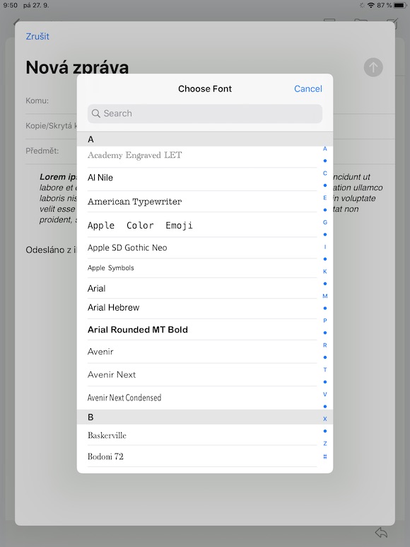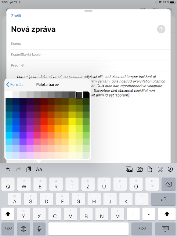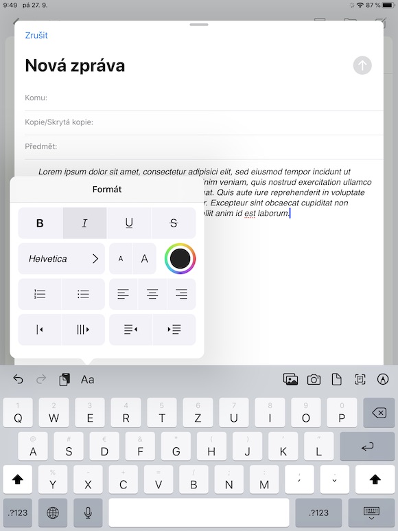 Výraznými změnami prošla v operačním systému iPadOS také nativní aplikace Mail. Tu Apple obohatil o nové funkce a možnosti formátování, připomínající prostředí Mailu pro Mac. Při tvorbě zprávy stačí klepnout na ikonku „Aa“ v nástrojové liště. Po klepnutí na tento symbol se vám zobrazí nová karta s nabídkou běžných nástrojů, potřebných pro úpravu textu. Můžete zde měnit zarovnání textu, jeho barvu, přepínat z tučného na kurzívu a další formáty, nastavit font písma, nebo třeba měnit odsazení.