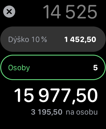 Apple Watch v minulých verzích aplikací Kalkulačka nedisponovaly, avšak v nové verzi watchOS 6 už je tato aplikace k dispozici. A Apple u ní udělal obrovský pokrok, jelikož nabízí více funkcí, než aplikace Kalkulačka v iOS. Součástí aplikace tedy není pouhá kalkulačka, ale když silně zatlačíte na displej ve spuštěné aplikaci, tak si můžete zvolit možnost Funkce Spropitné. Zde si můžete nastavit, jak velké dýško chcete podniku věnovat, a také můžete celkovou útratu rozdělit mezi několik osob.