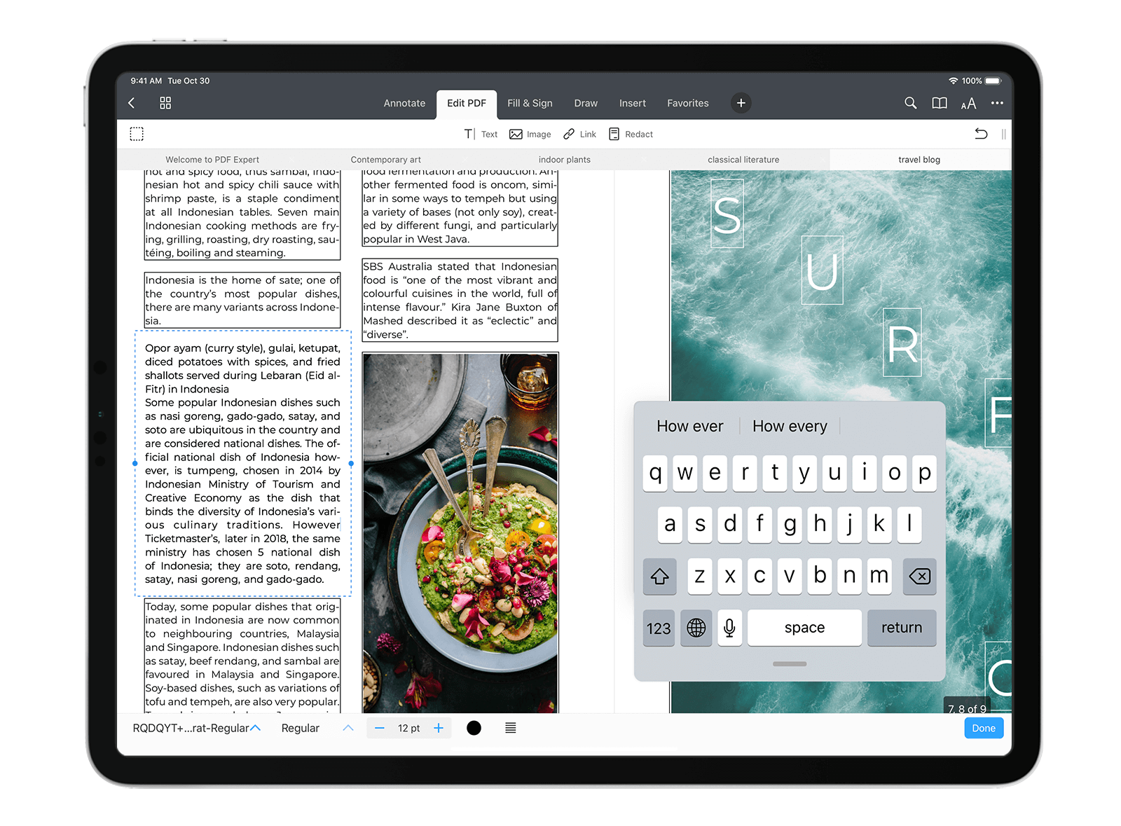 Pokud už jste někdy v PDF Expert 7 pracovali, tak jistě víte, že úprava dokumentů je s touto aplikací doopravdy hračka. Pokud jste však potřebovali něco dopsat, tak jste tak museli učinit skrze nevzhlednou a obrovskou systémovou klávesnici, která zabírá velkou plochu obrazovky. Společně s iPadOS 13 je však nově k dispozici využití létající klávesnice, která je malá a můžete si ji přemístit kdekoliv po obrazovce. Nemusíte tak využívat obrovské klávesnice a máte jistotu, že bez problémů jednoduše uvidíte celý PDF dokument tak, jak potřebujete. Abyste létající klávesnici vyvolali, tak stačí, abyste sevřeli dva prsty na softwarové klávesnici.