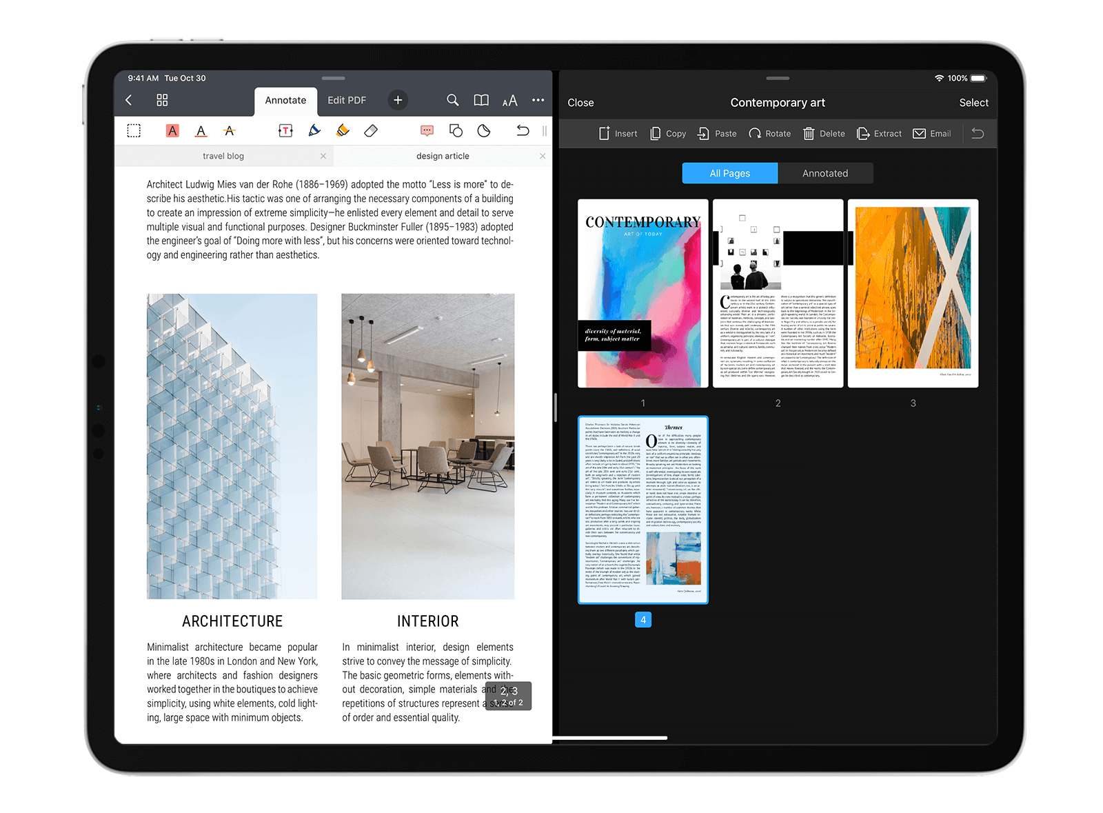 Společně s příchodem iPadOS 13 na váš iPad si konečně můžete otevřít více oken aplikace PDF Expert 7 najednou. To znamená, že na jedné obrazovce můžete bez problémů editovat dva různé dokumenty najednou. Apple dal vývojářům aplikací třetích stran v iPadOS 13 možnost této funkce využít i u svých aplikací a je nutno podotknout, že pro PDF Expert 7 se tato funkce hodí jako vyšitá. Potřebujete porovnat dva dokumenty vedle sebe? Je nutné, abyste společně s jedním dokumentem upravovali i druhý? Pokud jste si odpověděli kladně, tak se vám nová aktualizace PDF Expert 7 bude velice líbit. Stačí využít gesta táhni a pusť – jednoduše vezmete PDF soubor a přetáhnete jej na jednu stranu obrazovky.